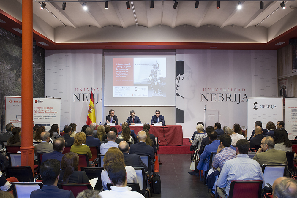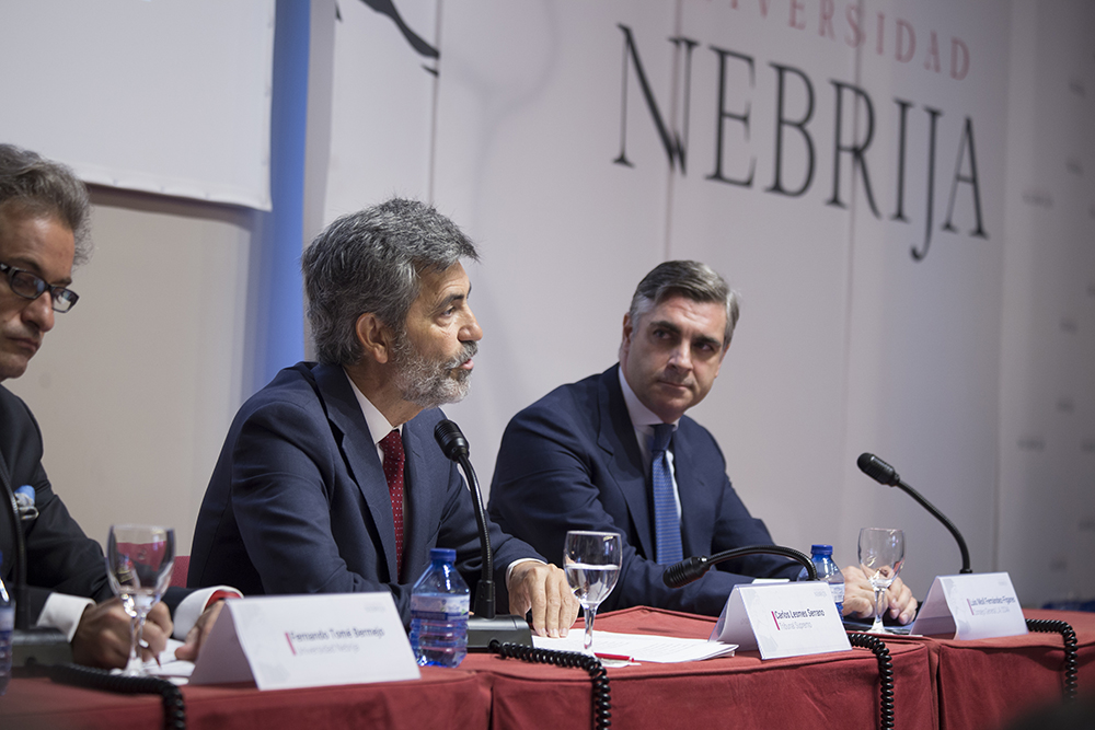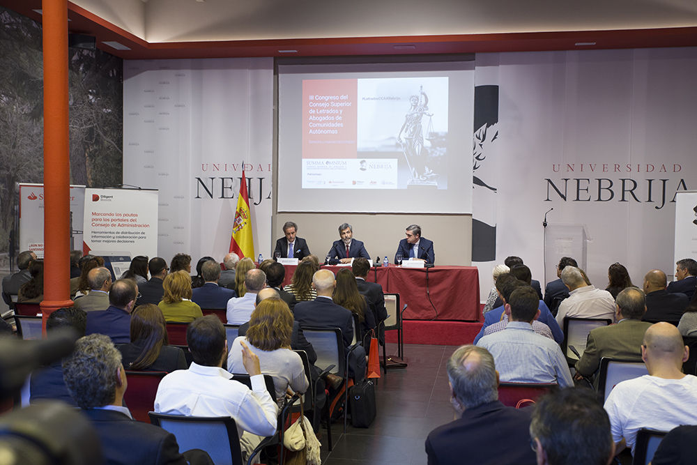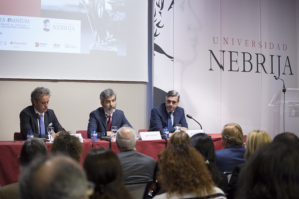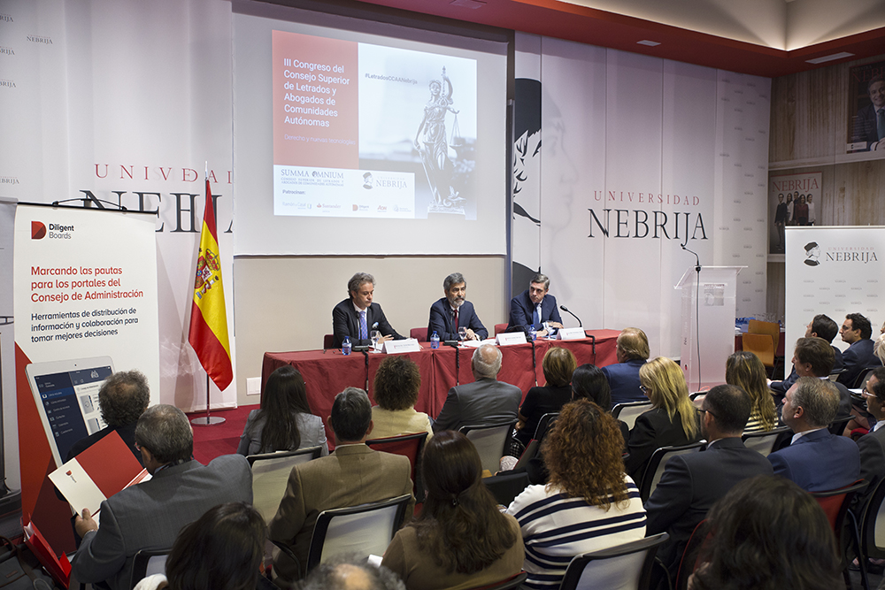 Carlos Lesmes, presidente del Tribunal Supremo y del Consejo General del Poder Judicial, Luis Moll, presidente del Consejo Superior de Letrados y Abogados de las Comunidades Autónomas, y Fernando Tomé, decano de la Facultad de Ciencias Sociales de la Universidad Nebrija, inauguraron ayer el III Congreso del Consejo Superior de Letrados y Abogados de las Comunidades Autónomas. Este congreso, con el título genérico de “Derecho y nuevas tecnologías”, se ha celebrado en el campus de Madrid-Princesa de la Universidad Nebrija los días 21 y 22 de septiembre.