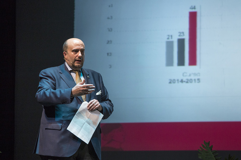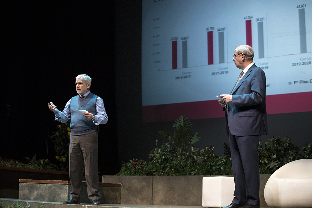 Los conductores del acto fueron Pilar Alcover y Javier Rodríguez de las Heras que, con mucho desparpajo, fueron introduciendo las distintas secciones en las que se dividió el acto para informar a los asistentes de los logros conseguidos y de los próximos retos a los que se enfrentará la Universidad en los próximos años.