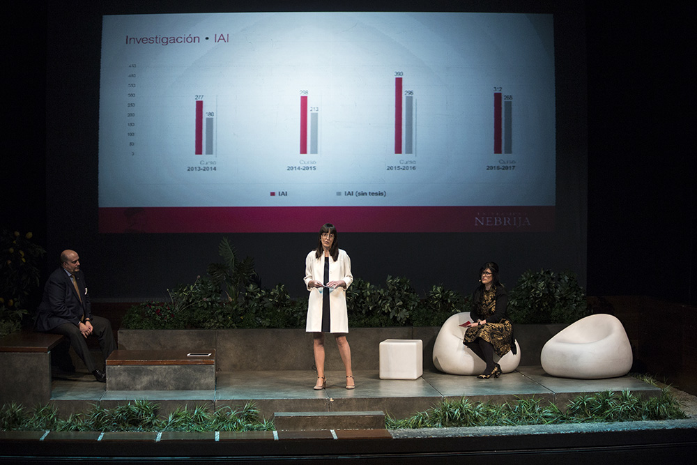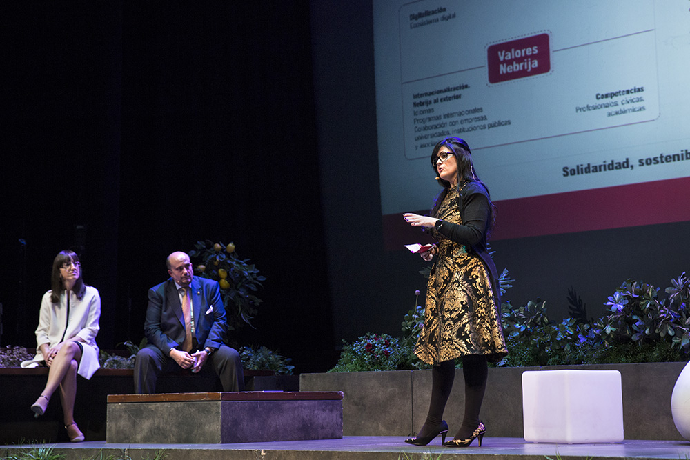 El rector Juan Cayón, junto a Susana Martín Leralta, decana de la Facultad de Lenguas y Educación, y Leire Nuere, directora de Global Campus Nebrija, también subieron al escenario para mostrar el camino recorrido y los próximos objetivos. Cayón explicó la importancia de los rankings en los que la Universidad está participando y que muestran su reconocimiento dentro del mundo universitario. Susana Martín Leralta hizo hincapié en uno de los grandes retos que todavía le quedan por alcanzar a la Universidad: mejorar en investigación. “Tenemos que seguir trabajando en proyectos de investigación con mejor financiación”, explicó la decana. Por su parte, Leire Nuere explicó el modelo de transversalidad que la Universidad va a poner en marcha. Un modelo de educación integral que permita a los alumnos completar su formación en muchas vertientes y, como explicó la directora de Global Campus, sus ejes serán “la metodología, la digitalización, la internacionalización y las competencias”.
