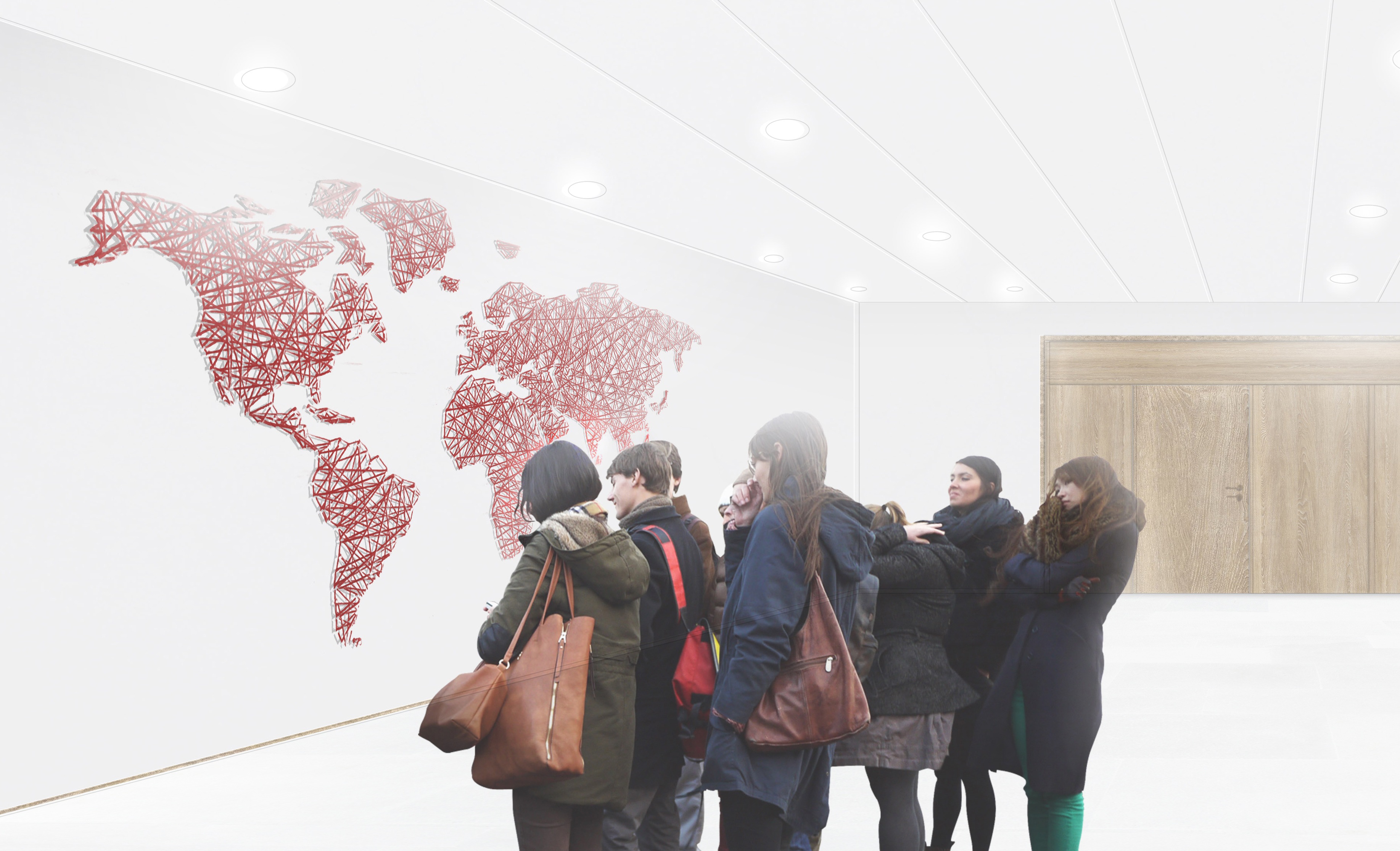 Con la intención de hacer visible la labor social que desempeña Entreculturas, se propone la incorporación de fotografías y videos que narran la acción internacional de la Fundación, en un gran mosaico que abraza al visitante en la zona de recepción. Un gran “cronograma vivo” mostrará las campañas, eventos y actividades, mediante paneles ligeros, intercambiables y editables. Todas las zonas intervenidas son colonizadas por pequeños “muros de expresión”, incluyendo un gran mapa del mundo realizado a mano por los alumnos de Universidad Nebrija, logrando una personalización controlada del espacio.