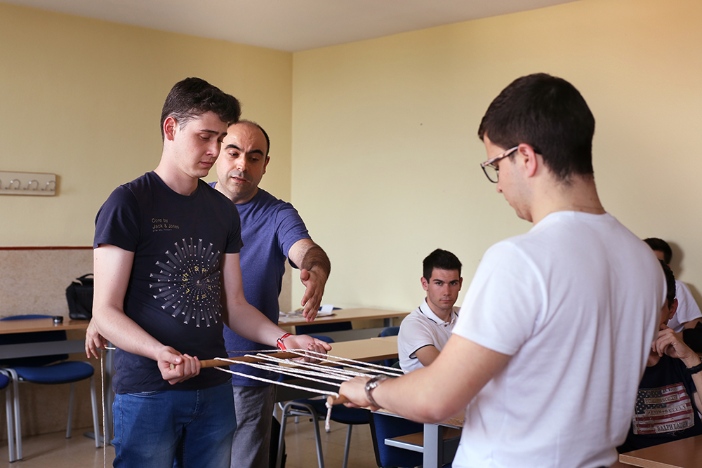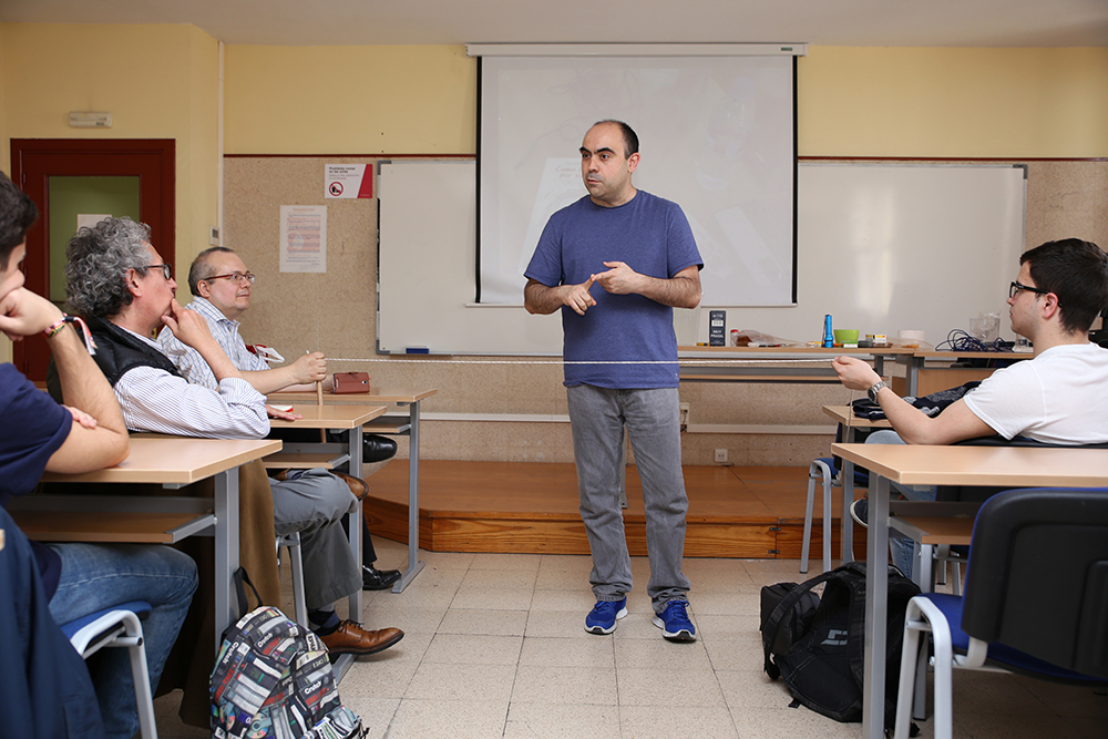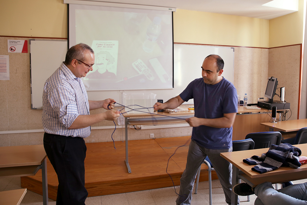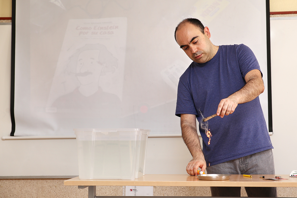 En lo que él llamaba “cacharrear con experimentos”, y siempre con materiales caseros, mostró cómo “yo puedo sacar mi coche del agua pero tú tienes que llamar a la grúa”, mientras multiplicaba, mediante las leyes de la polea, su propia fuerza frente a la de los alumnos, “muchos más cachas que yo. Y puedo con dos”. Hacer el vacío para conservar alimentos sin una bomba de vacío cara ni bolsas especiales sino con un recipiente lleno de agua, bolas de congelados y las leyes de Pascal, partir cuerdas sin cuchillos gracias al rozamiento y encender fuego sin cerillas mediante a una pila eléctrica, hilo de hierro y papel higiénico, “ese gran amigo”, fueron algunos de los experimentos que Javier Fernández Panadero llevó a cabo.