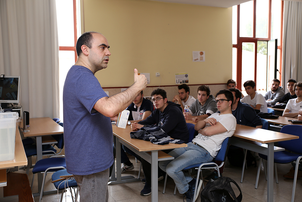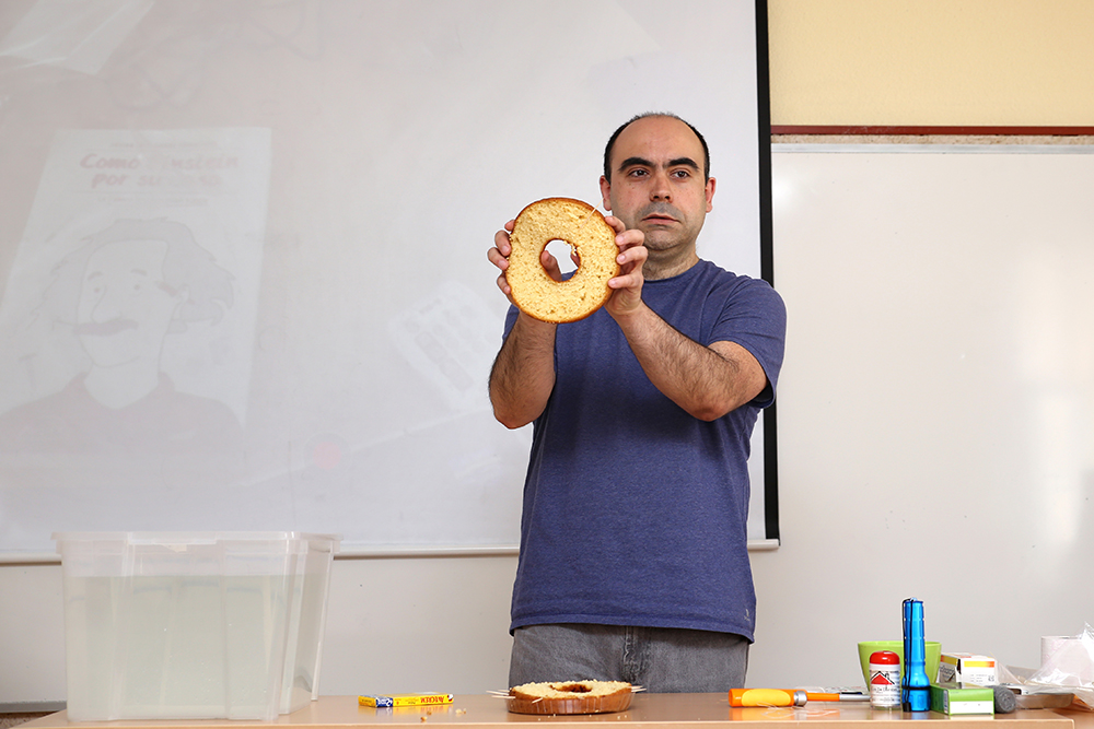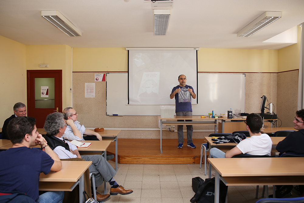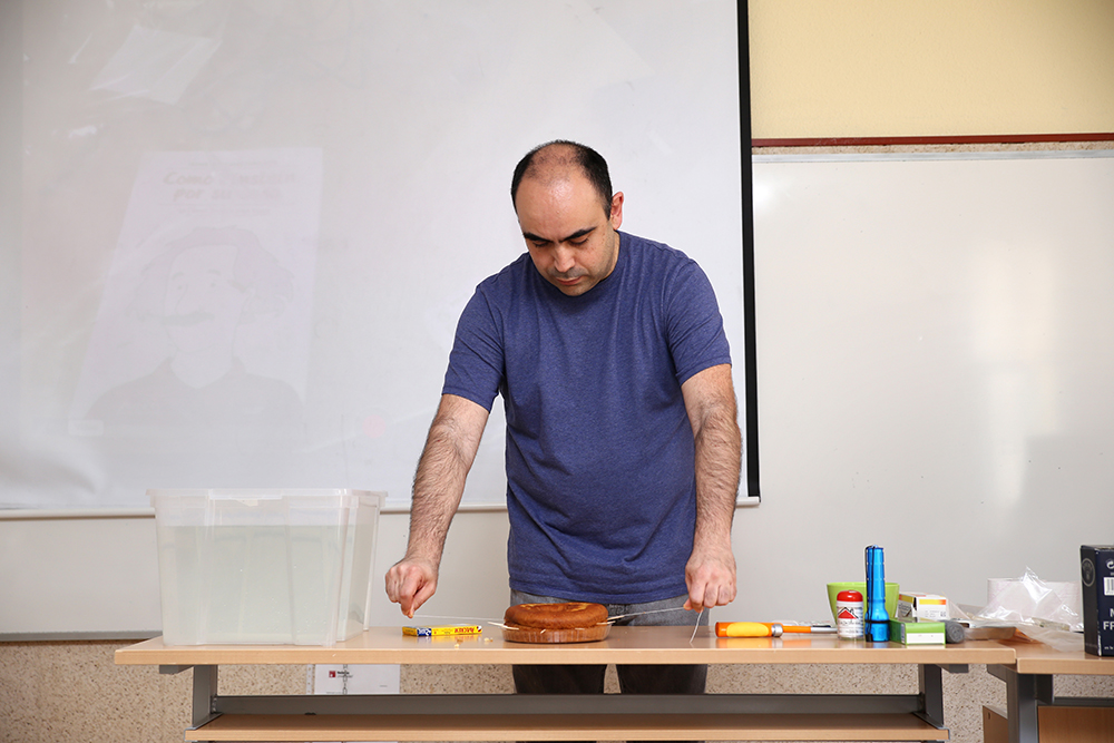 Dentro de la Semana de la Ingeniería de la Escuela Politécnica Superior, se celebró la sesión “Ciencias para explicar el mundo”, a cargo del físico y divulgador científico Javier Fernández Panadero. Con materiales de andar por casa, literalmente, bolsas de congelado, cuerda de tender, baldes agua y estropajos metálicos, llevó a cabo una exhibición sobre cómo solucionar problemas cotidianos gracias a la ciencia. “No estoy de acuerdo con esa afirmación que dice que la ciencia, en la vida diaria, no sirve para nada. Al revés, cómo yo sé ciencia, soluciono problemas o me ahorro dinero poniendo en práctica sencillas leyes de la física”, asegura este profesor de secundaria y autor de diversos libros de divulgación, el último de los cuales es Como Einstein por su casa. La bricociencia para todos.