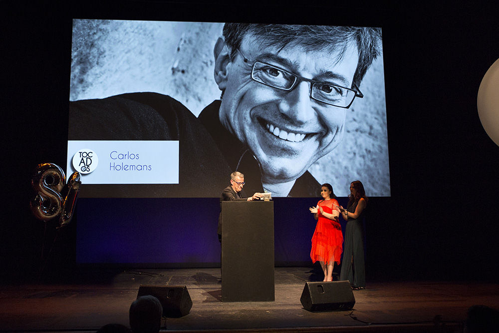 Uno de los premios más importantes de la noche fue el Premio a la Trayectoria Profesional que los alumnos entregaron a Carlos Holemans, presidente y fundador de El Laboratorio y uno de los publicitarios más reconocidos en el panorama nacional e internacional. “Pertenezco a una generación de creativos obsesionados con la belleza. porque creo que nada conmueve ni permanece en la memoria tanto como la belleza –explicó el publicista–. Nadie seduce ni enamora profundamente ignorando la belleza. Y aquí hemos venido a seducir y a enamorar”. Holemans agradeció el premio recordando que el primer anuncio realizado por El Laboratorio, hacía 16 años, fue también premiado por los estudiantes de la Universidad Nebrija con un Premio Tocado. También aconsejó a los alumnos que se esforzaran al máximo para ser los mejores: “La inteligencia es un músculo que se cultiva practicándolo, esforzándose en pensar más allá de lo que piensan los demás, viendo lo que nadie vio antes”