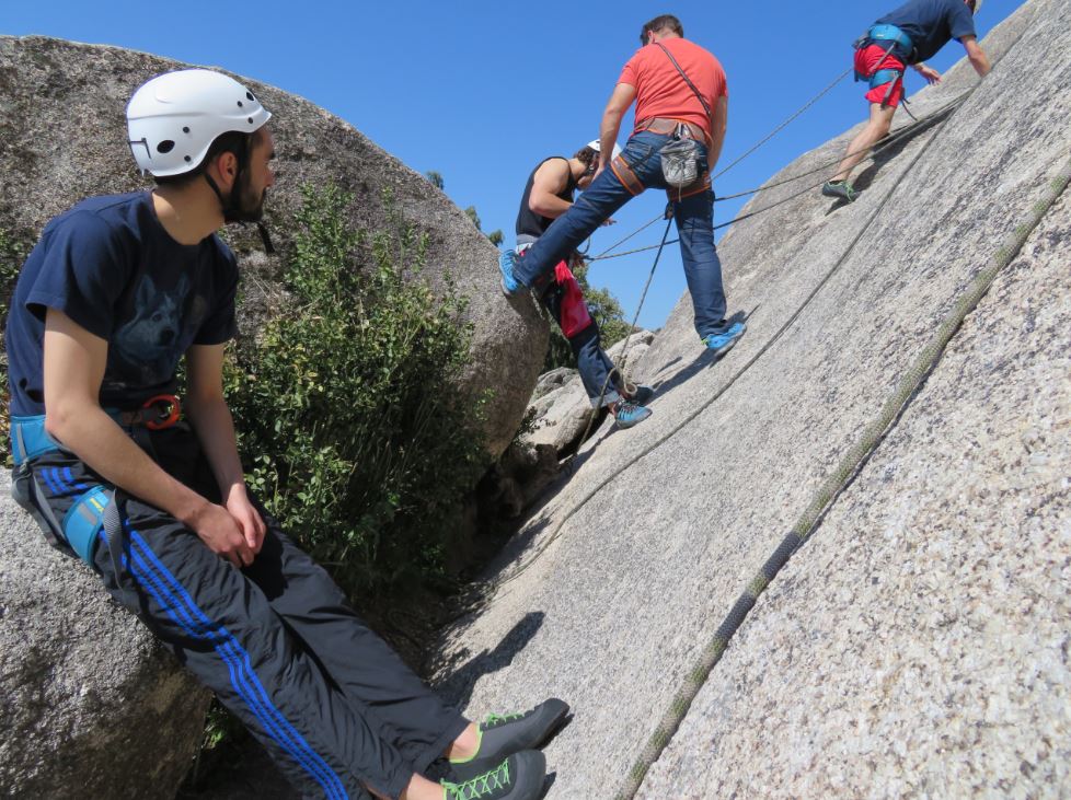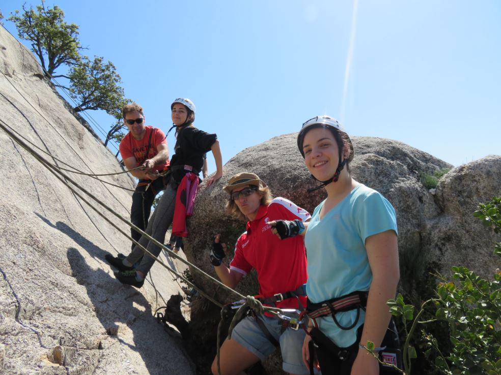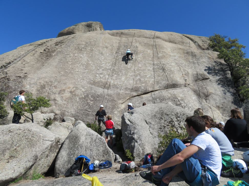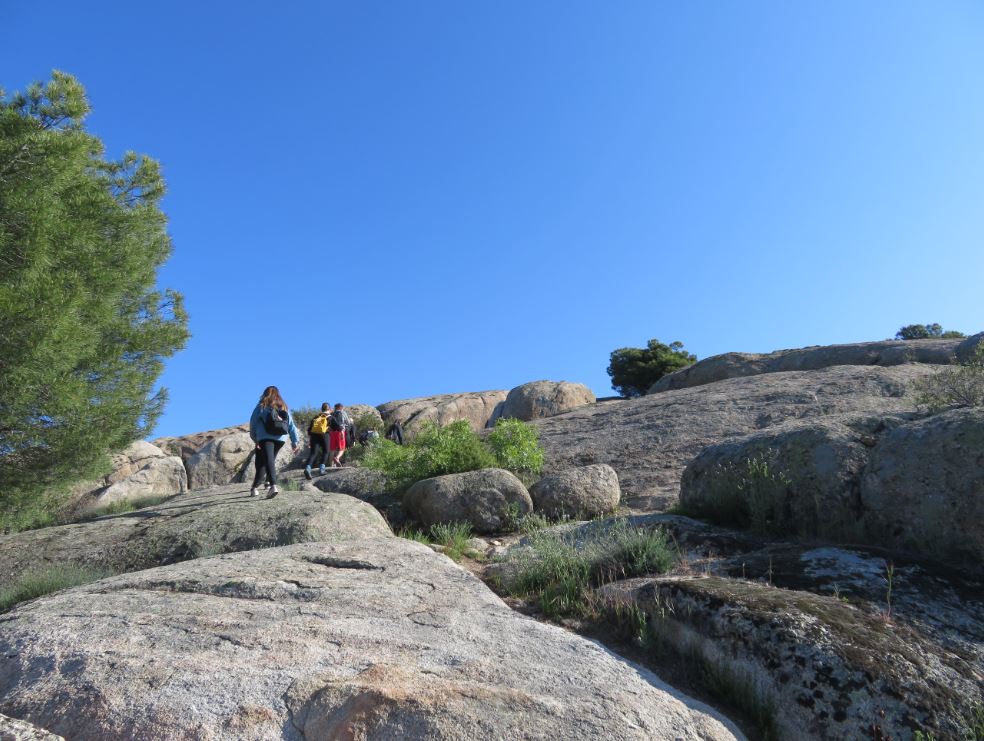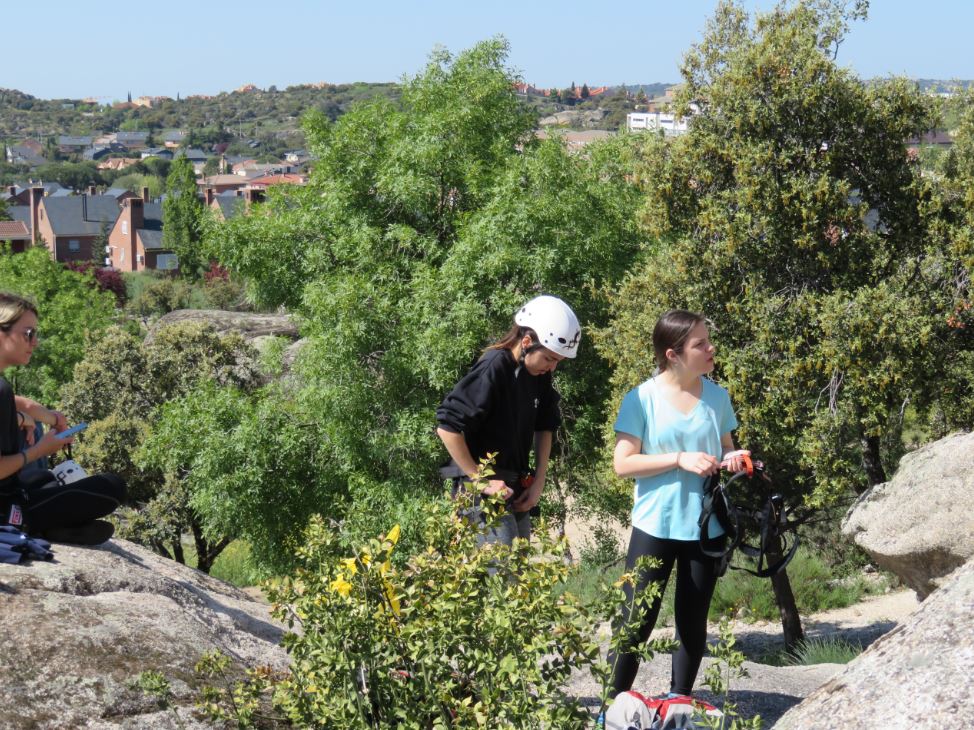 A primera hora de la mañana el autobús desplazó a nuestros alumnos a la localidad de Torrelodones para acceder caminando a las numerosas vías “equipadas” de escalada deportiva que hay en esta zona. De la mano de dos técnicos de escalada de la Federación de Montaña, y divididos en dos grupos, los participantes pudieron practicar las distintas técnicas de escalada en piedra natural y rápel (descenso).