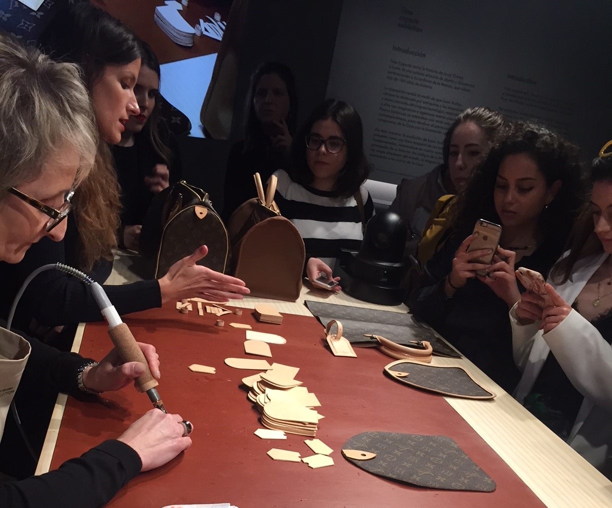 Al inicio de la exposición, nuestros alumnos se vieron sorprendidos con la oportunidad de poder ver y conversar con una de las artesanas de la Maison, con más de 20 años de experiencia, que realizaba el minucioso trabajo de pintar a mano piezas de piel y con calor marcarlas como una de las señas de identidad de la Casa. Durante la visita guiada, han recorrido los cuatro temas principales de la exposición: los códigos de la Maison, los viajes, la elegancia en movimiento y los iconos.