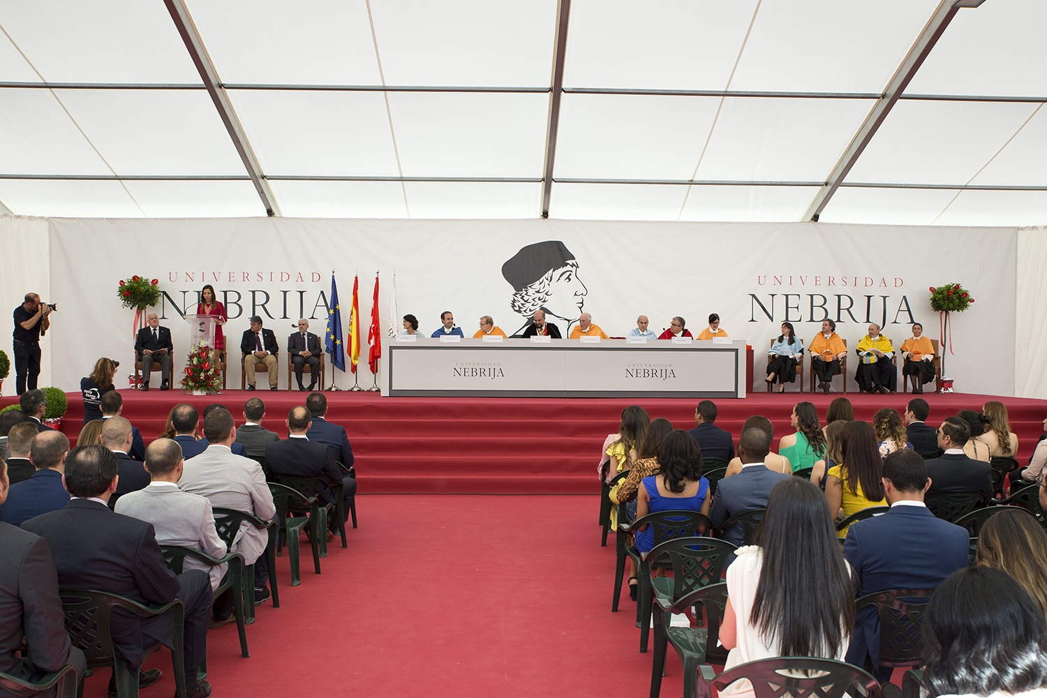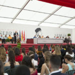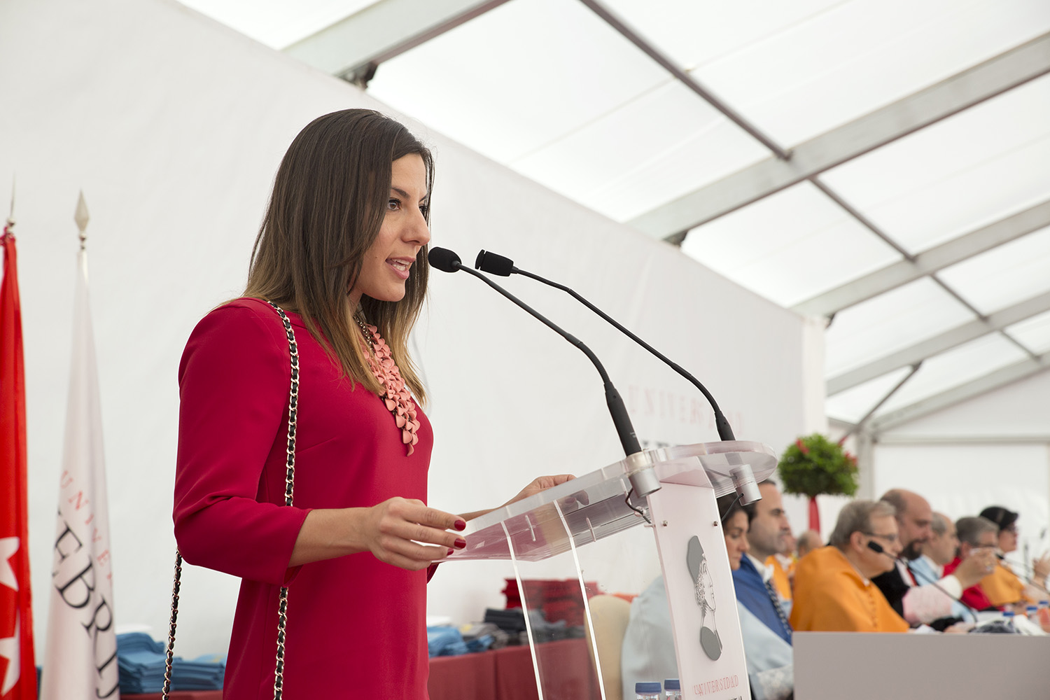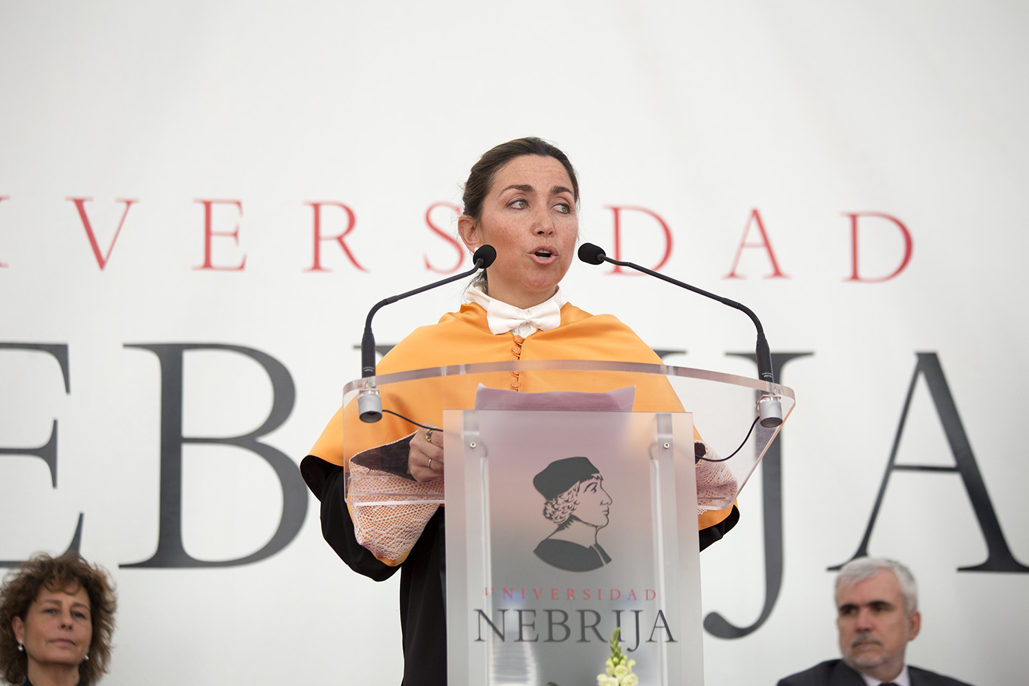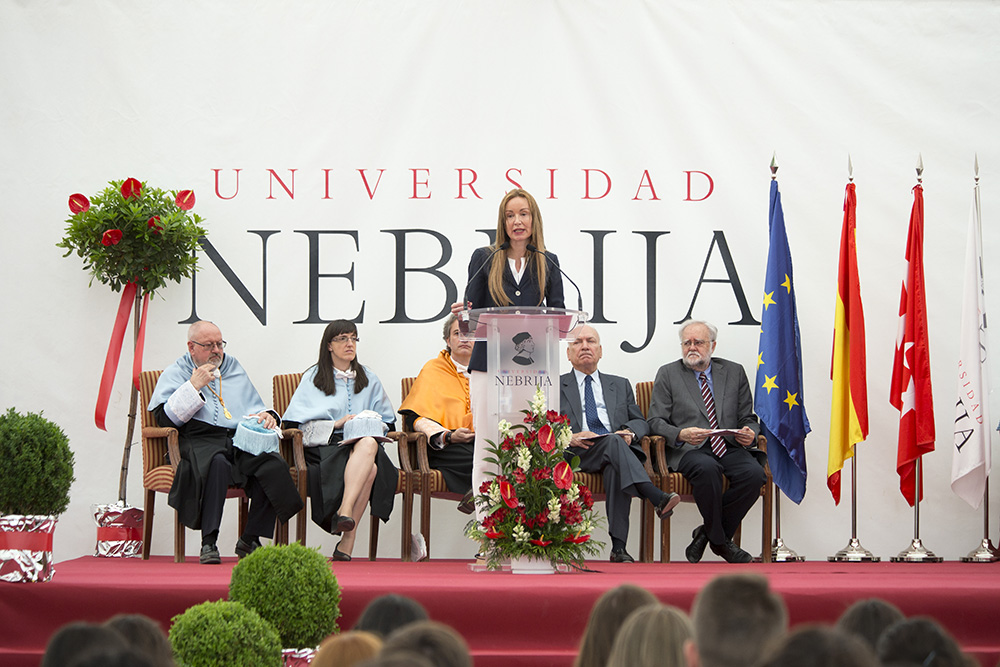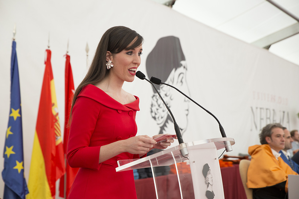 María Riesco, estudiante de Global Campus Nebrija, hizo referencia al poeta Constantino Cavafis y su conocido poema Ítaca y animó a sus compañeros a no cesar en su empeño por conseguir ser mejores: “Encontrad lo que os apasione, tened suerte en el camino, pero, sobre todo, disfrutad del viaje”. Carla Díaz Arena, alumna de grado de la Facultad de Lenguas y Educación, destacó en su discurso en nombre de los alumnos de grado que “tras mucho esfuerzo, alegrías y momentos difíciles” veía a sus compañeros allí reunidos como profesionales. A todos ellos les pidió confianza en sí mismos y que no tuvieran miedo a los fallos, porque “de los errores también se aprende”. La alumna Sandra Izquierdo Sanz, en representación de los alumnos de máster, instó a sus compañeros a “cambiar el mundo con lo que aquí hemos aprendido” y les pidió que fueran “inconformistas” con su formación y siguieran buscando más conocimiento que adquirir. Izquierdo no olvidó agradecer a los familiares el apoyo ofrecido durante su formación y a los profesores por ofrecer lo mejor de sí mismos a los alumnos.