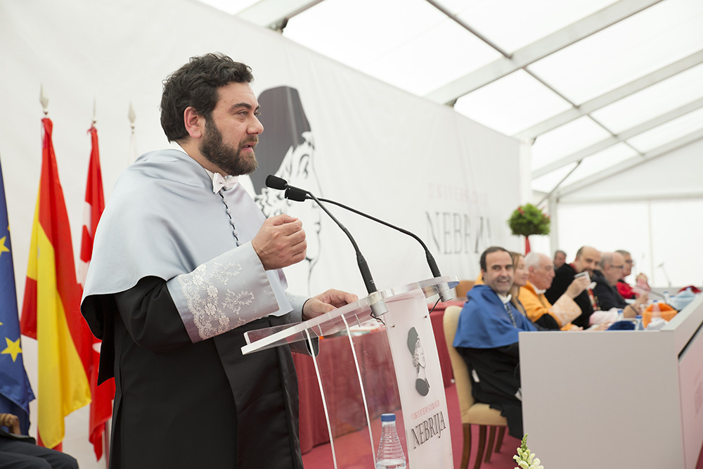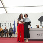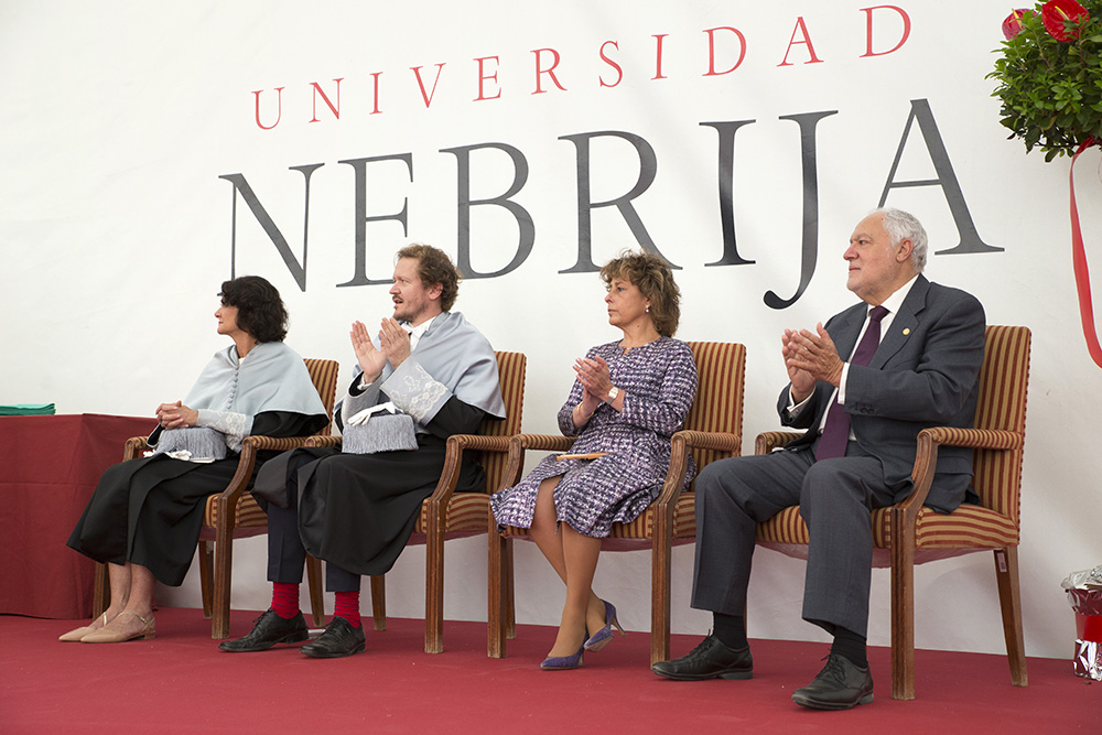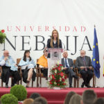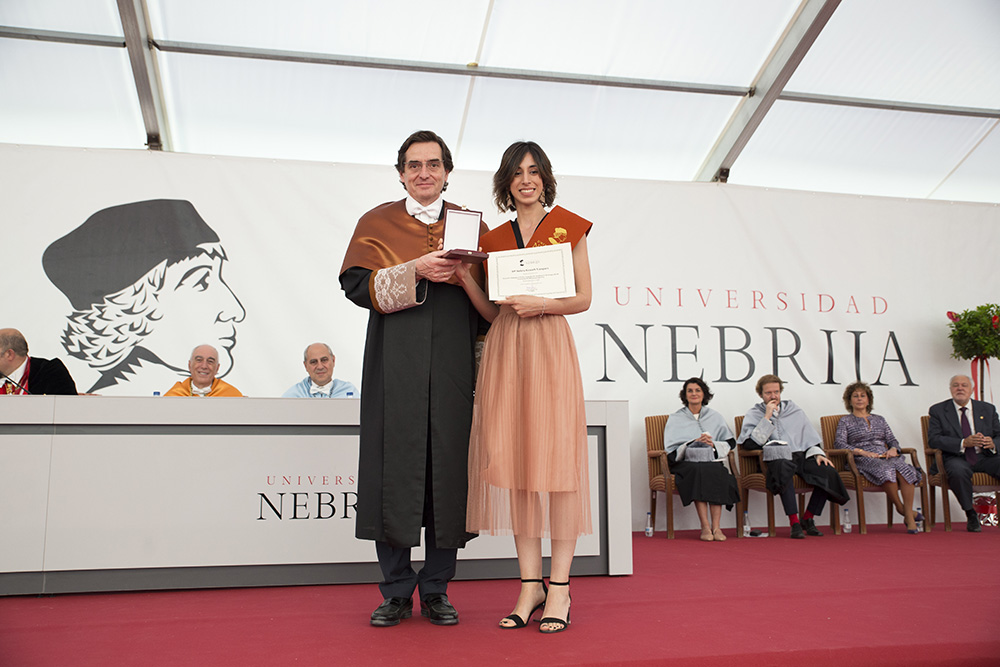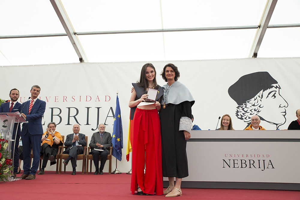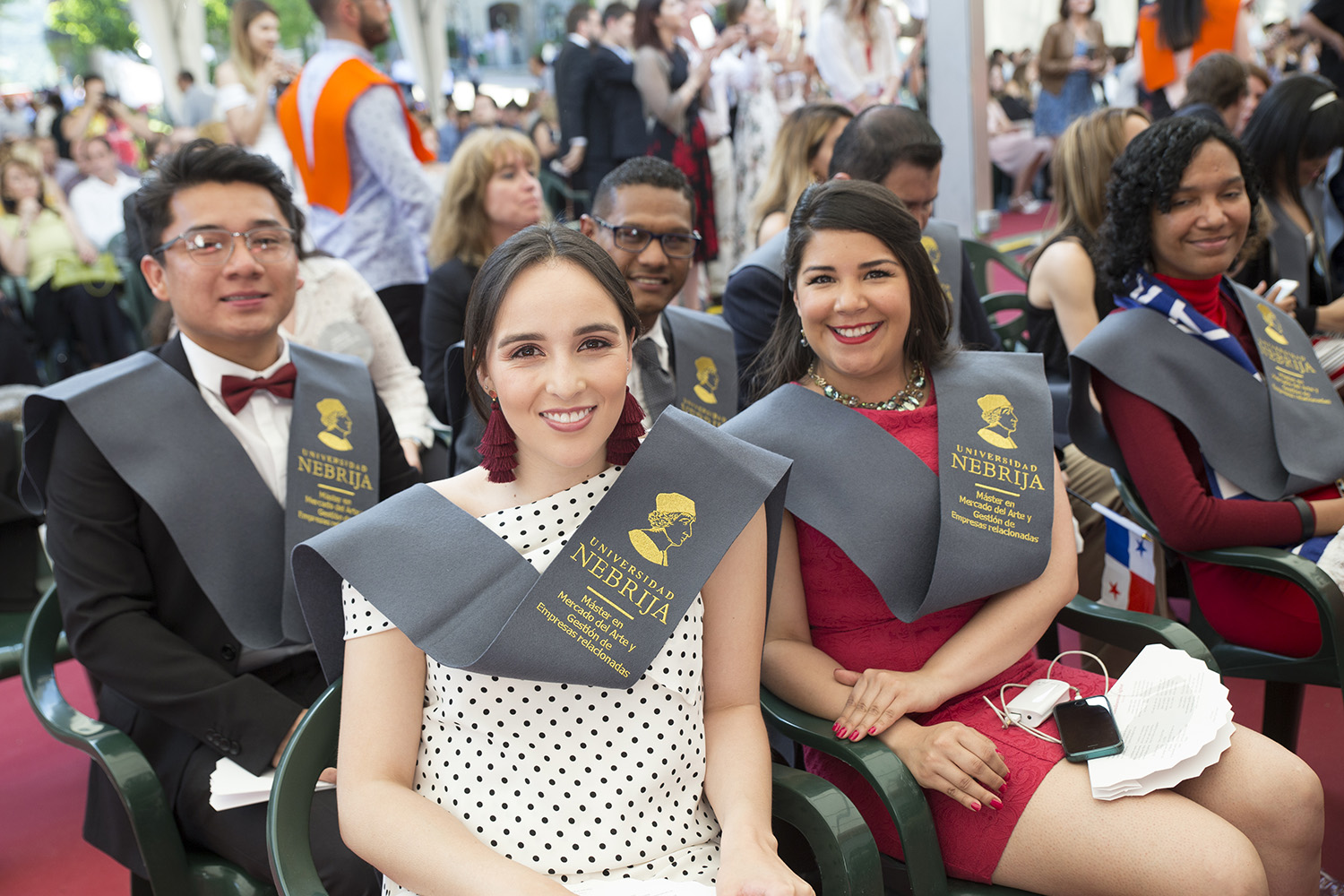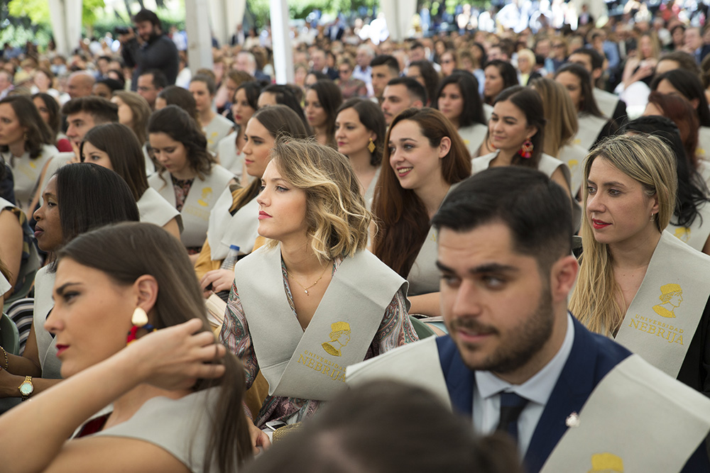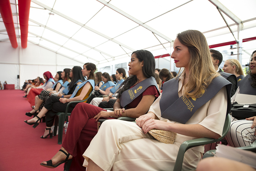María Riesco, estudiante de Global Campus Nebrija, hizo referencia al poeta Constantino Cavafis y su conocido poema Ítaca y animó a sus compañeros a no cesar en su empeño por conseguir ser mejores: “Encontrad lo que os apasione, tened suerte en el camino, pero, sobre todo, disfrutad del viaje”. Carla Díaz Arena, alumna de grado de la Facultad de Lenguas y Educación, destacó en su discurso en nombre de los alumnos de grado que “tras mucho esfuerzo, alegrías y momentos difíciles” veía a sus compañeros allí reunidos como profesionales. A todos ellos les pidió confianza en sí mismos y que no tuvieran miedo a los fallos, porque “de los errores también se aprende”. La alumna Sandra Izquierdo Sanz, en representación de los alumnos de máster, instó a sus compañeros a “cambiar el mundo con lo que aquí hemos aprendido” y les pidió que fueran “inconformistas” con su formación y siguieran buscando más conocimiento que adquirir. Izquierdo no olvidó agradecer a los familiares el apoyo ofrecido durante su formación y a los profesores por ofrecer lo mejor de sí mismos a los alumnos.
