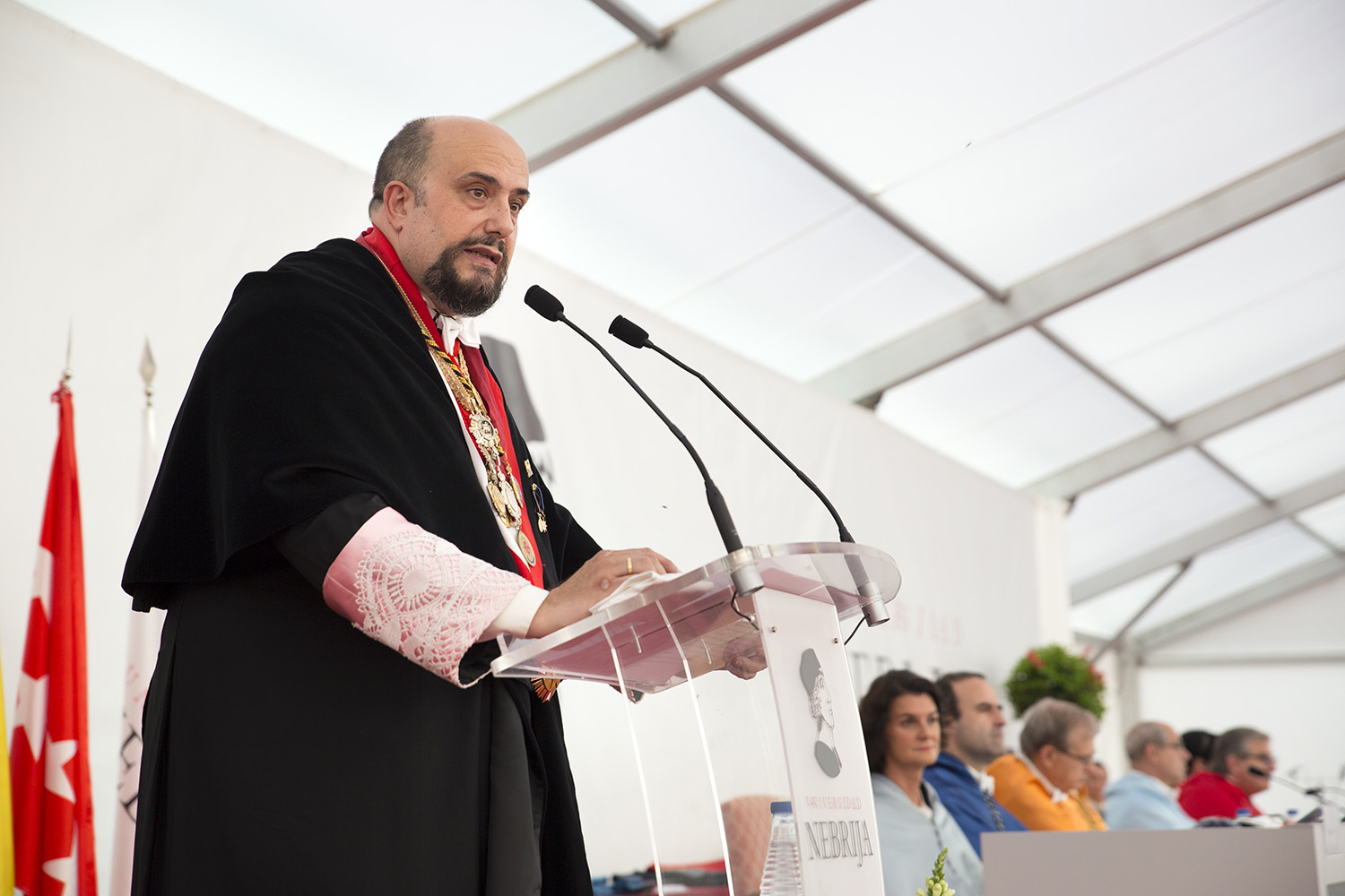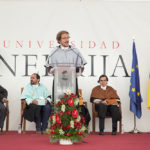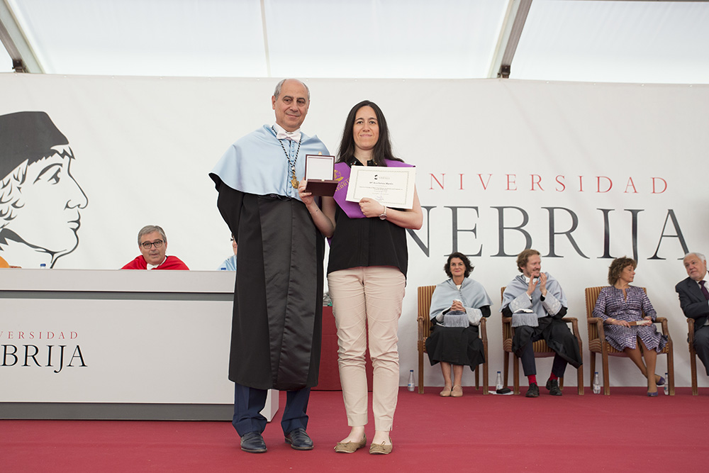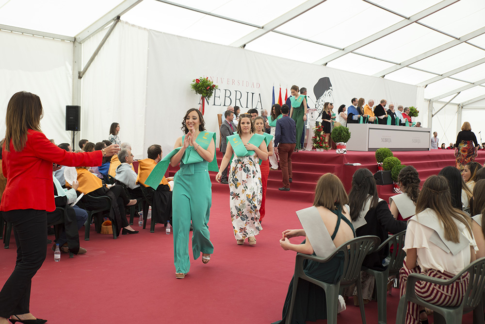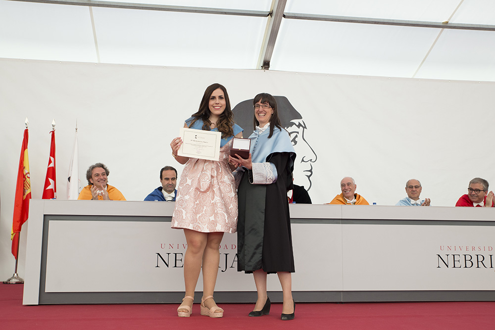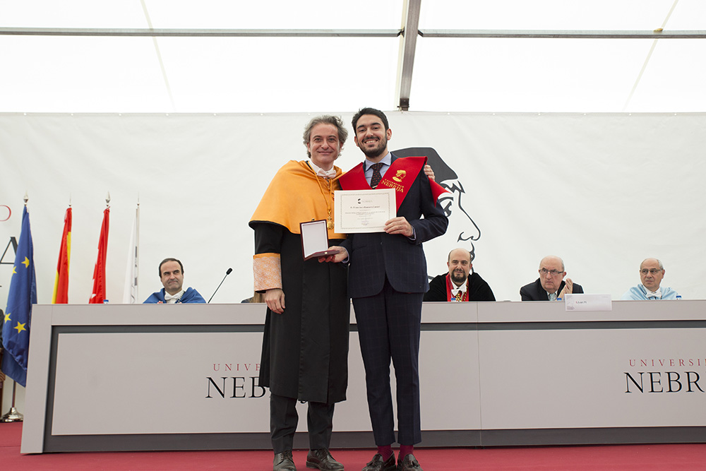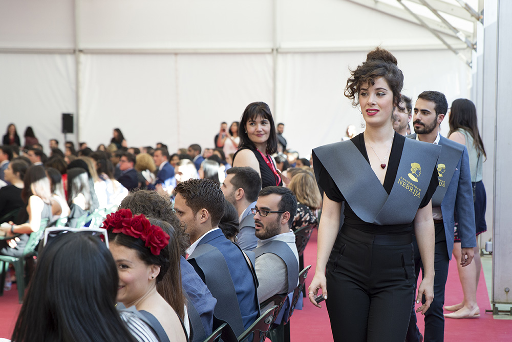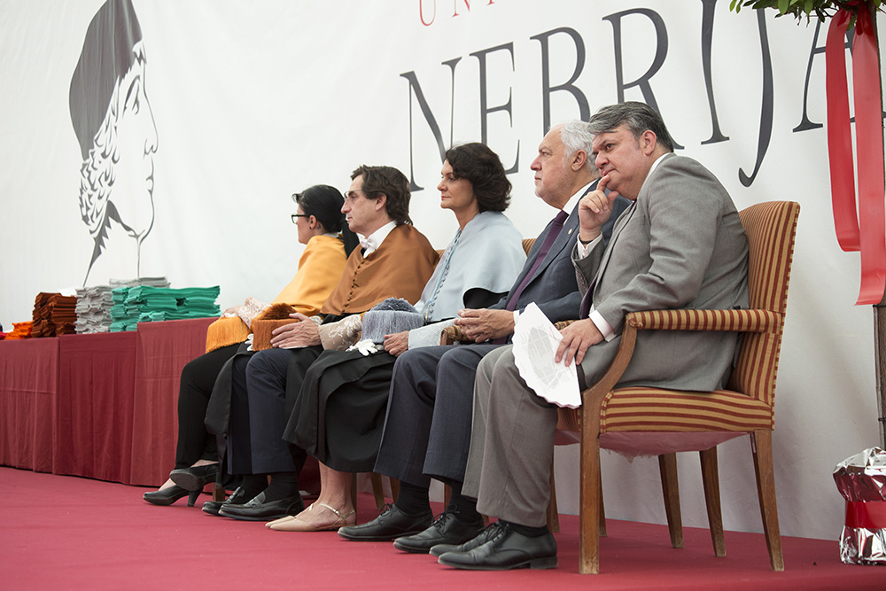 María Riesco, estudiante de Global Campus Nebrija, hizo referencia al poeta Constantino Cavafis y su conocido poema Ítaca y animó a sus compañeros a no cesar en su empeño por conseguir ser mejores: “Encontrad lo que os apasione, tened suerte en el camino, pero, sobre todo, disfrutad del viaje”. Carla Díaz Arena, alumna de grado de la Facultad de Lenguas y Educación, destacó en su discurso en nombre de los alumnos de grado que “tras mucho esfuerzo, alegrías y momentos difíciles” veía a sus compañeros allí reunidos como profesionales. A todos ellos les pidió confianza en sí mismos y que no tuvieran miedo a los fallos, porque “de los errores también se aprende”. La alumna Sandra Izquierdo Sanz, en representación de los alumnos de máster, instó a sus compañeros a “cambiar el mundo con lo que aquí hemos aprendido” y les pidió que fueran “inconformistas” con su formación y siguieran buscando más conocimiento que adquirir. Izquierdo no olvidó agradecer a los familiares el apoyo ofrecido durante su formación y a los profesores por ofrecer lo mejor de sí mismos a los alumnos.