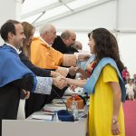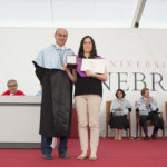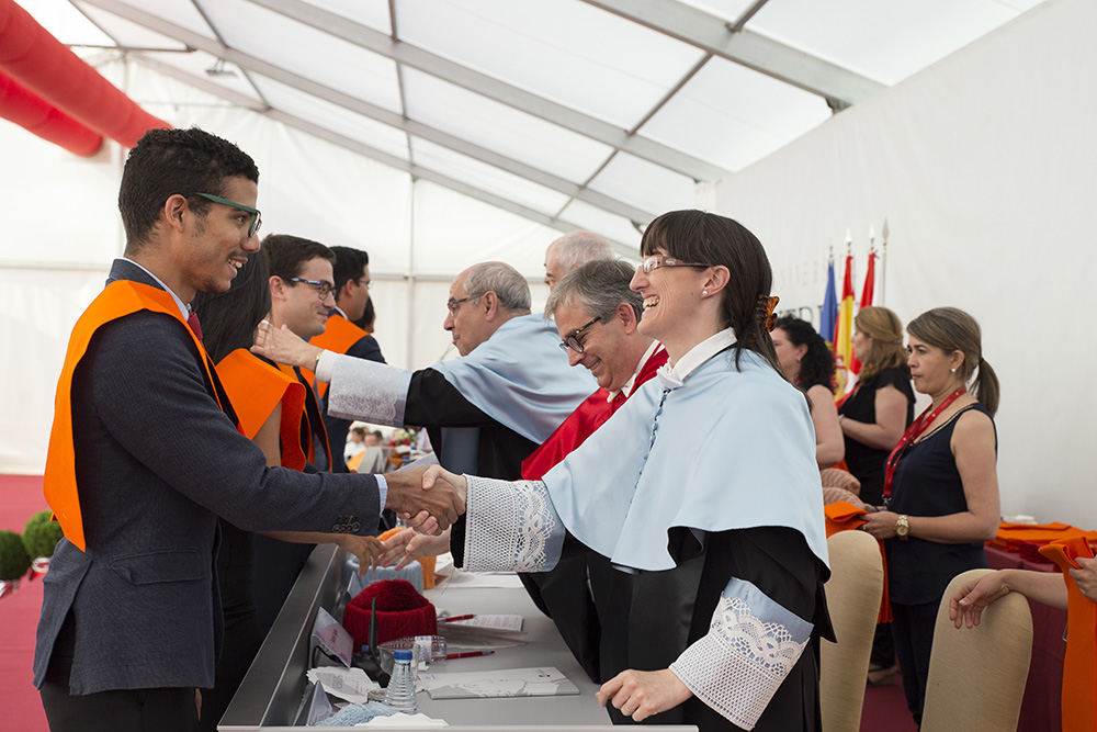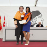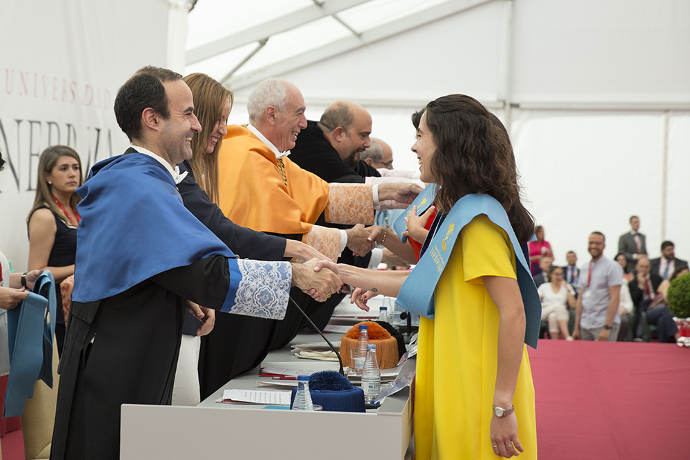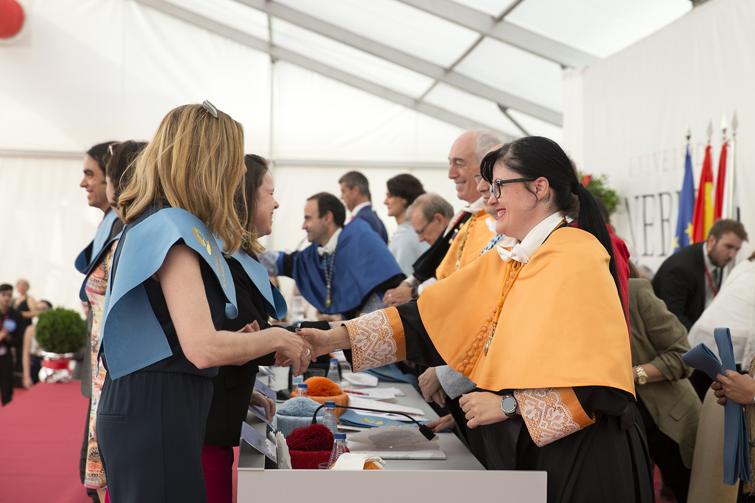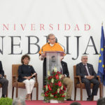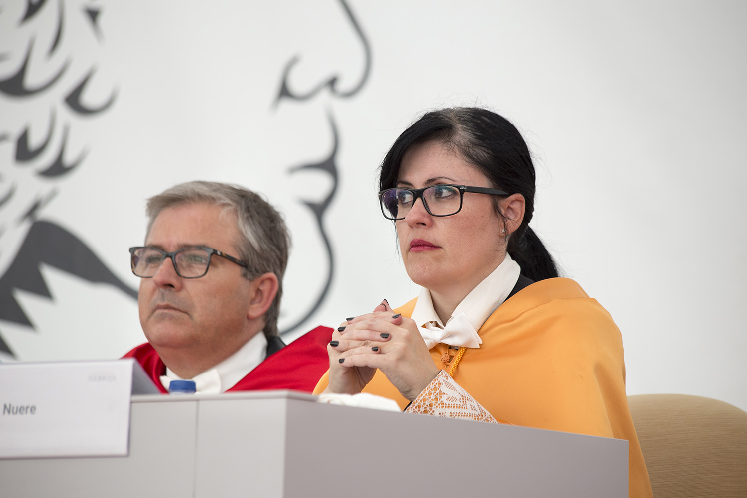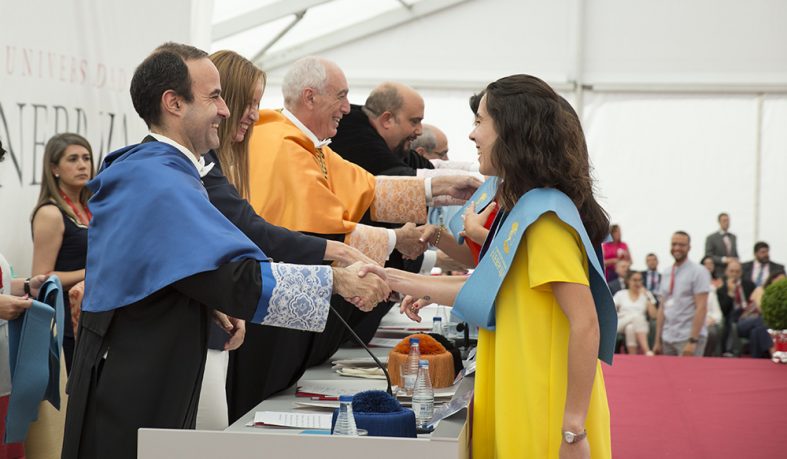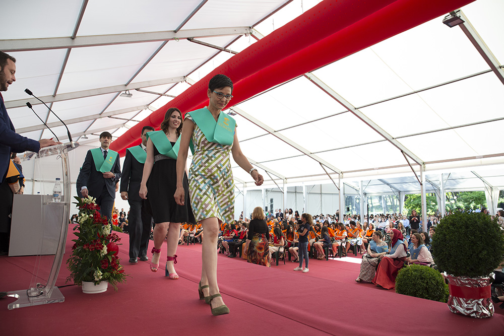 María Riesco, estudiante de Global Campus Nebrija, hizo referencia al poeta Constantino Cavafis y su conocido poema Ítaca y animó a sus compañeros a no cesar en su empeño por conseguir ser mejores: “Encontrad lo que os apasione, tened suerte en el camino, pero, sobre todo, disfrutad del viaje”. Carla Díaz Arena, alumna de grado de la Facultad de Lenguas y Educación, destacó en su discurso en nombre de los alumnos de grado que “tras mucho esfuerzo, alegrías y momentos difíciles” veía a sus compañeros allí reunidos como profesionales. A todos ellos les pidió confianza en sí mismos y que no tuvieran miedo a los fallos, porque “de los errores también se aprende”. La alumna Sandra Izquierdo Sanz, en representación de los alumnos de máster, instó a sus compañeros a “cambiar el mundo con lo que aquí hemos aprendido” y les pidió que fueran “inconformistas” con su formación y siguieran buscando más conocimiento que adquirir. Izquierdo no olvidó agradecer a los familiares el apoyo ofrecido durante su formación y a los profesores por ofrecer lo mejor de sí mismos a los alumnos.