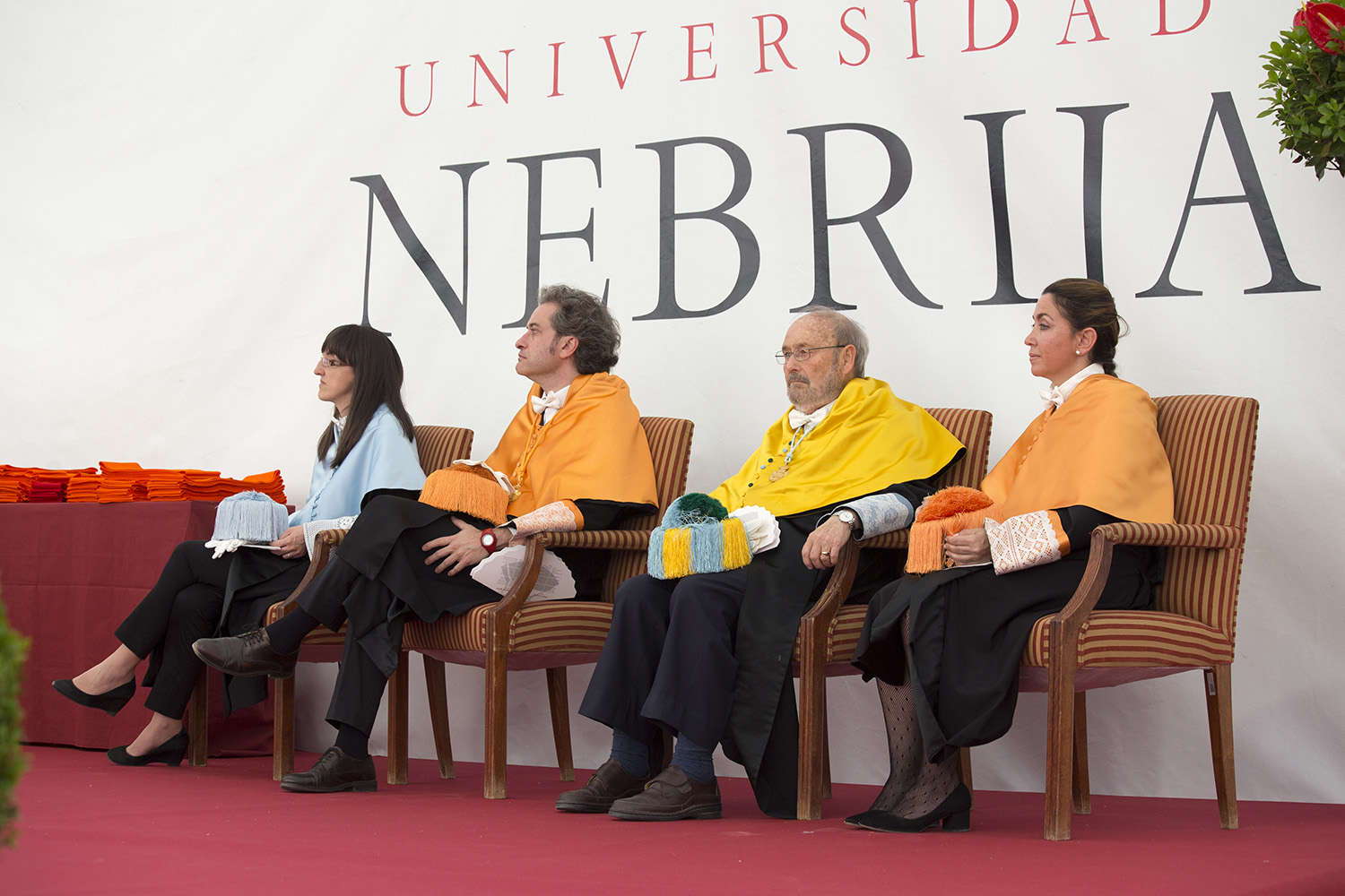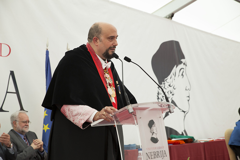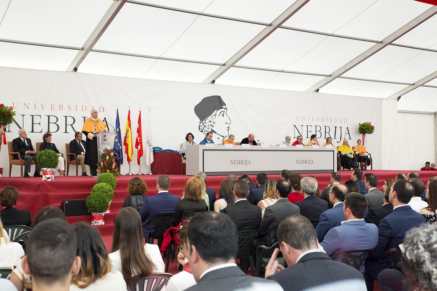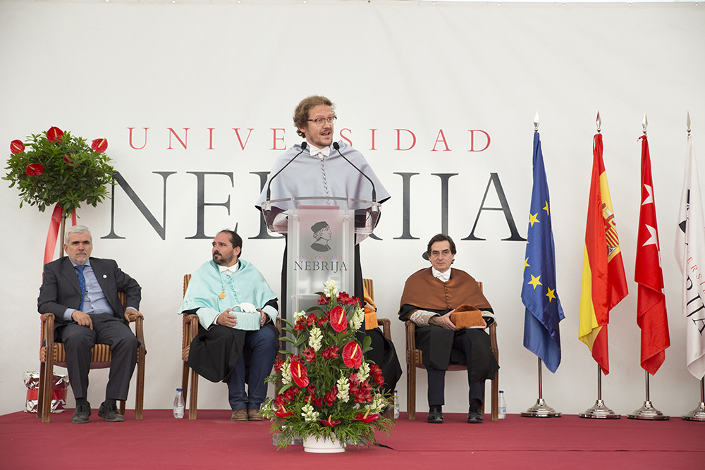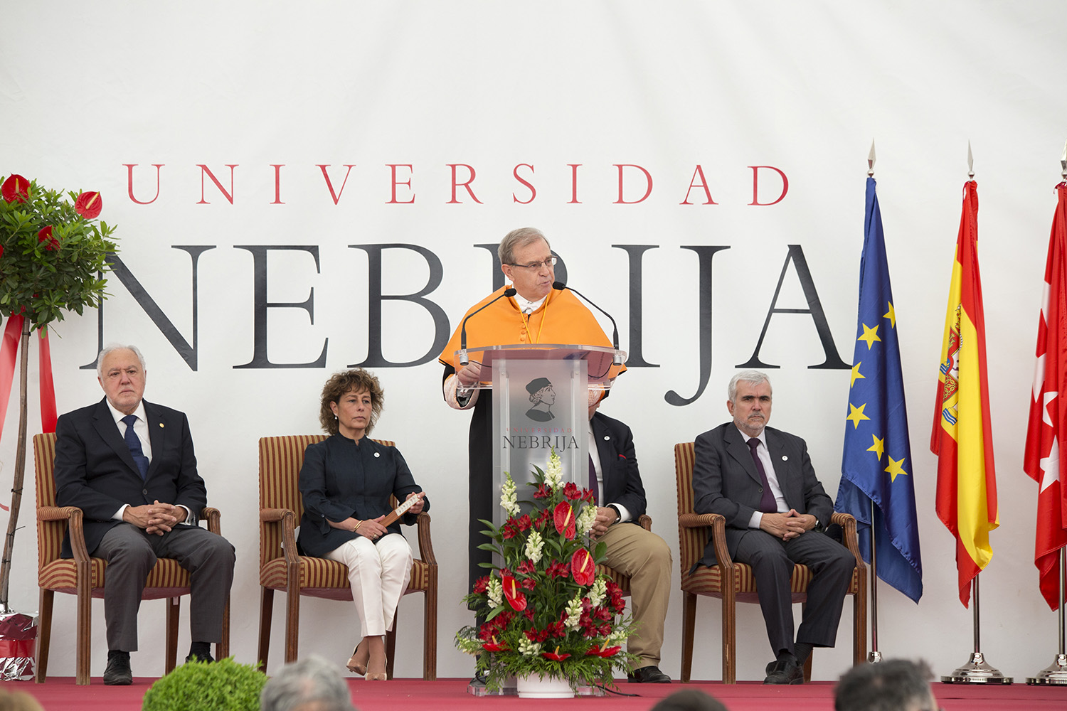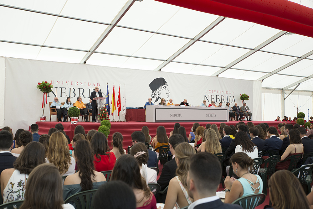 El rector Juan Cayón, como es tradición, también se dirigió a los alumnos para despedirse de ellos. Cayón quiso transmitirles tranquilidad porque “aunque penséis que no estáis preparados, comprobaréis que sí lo estáis, tenéis formación y valores”. Se mostró muy satisfecho con el deber cumplido por parte de todo el claustro de profesores que ven terminado su trabajo cuando termina esta etapa y felicitó a todos aquellos que han colaborado en la formación de los alumnos por “el compromiso de todos por dar lo mejor de cada uno y hacer el mejor trabajo posible”. A los alumnos les dijo que “la Universidad Nebrija siempre será vuestra casa, representadla bien porque está en vuestra mano mejorar el mundo”.