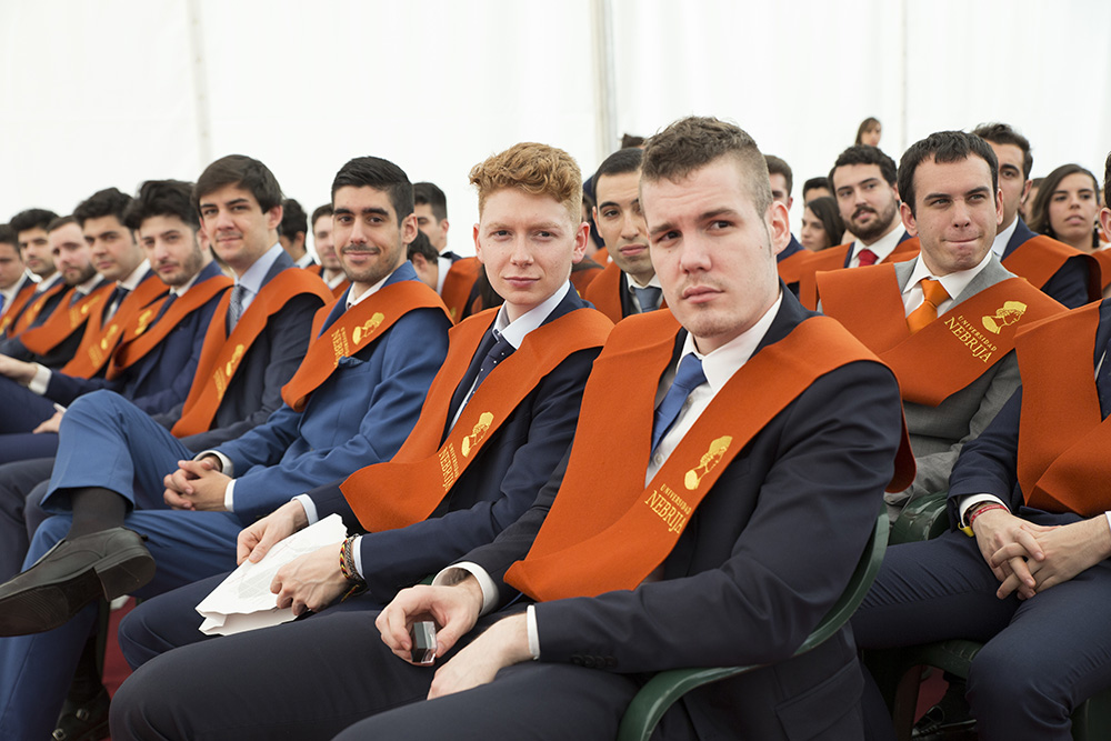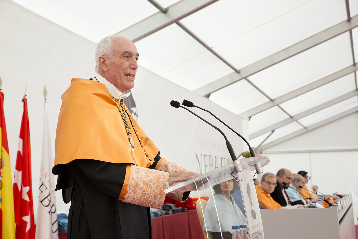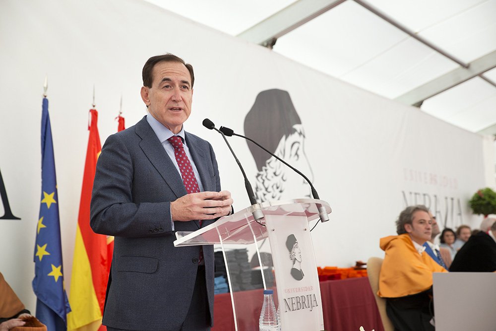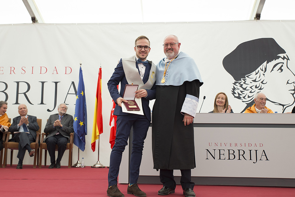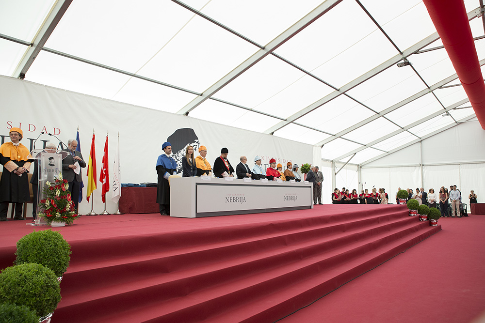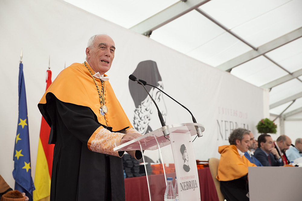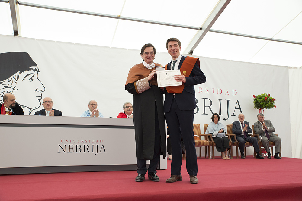 El rector Juan Cayón, como es tradición, también se dirigió a los alumnos para despedirse de ellos. Cayón quiso transmitirles tranquilidad porque “aunque penséis que no estáis preparados, comprobaréis que sí lo estáis, tenéis formación y valores”. Se mostró muy satisfecho con el deber cumplido por parte de todo el claustro de profesores que ven terminado su trabajo cuando termina esta etapa y felicitó a todos aquellos que han colaborado en la formación de los alumnos por “el compromiso de todos por dar lo mejor de cada uno y hacer el mejor trabajo posible”. A los alumnos les dijo que “la Universidad Nebrija siempre será vuestra casa, representadla bien porque está en vuestra mano mejorar el mundo”.