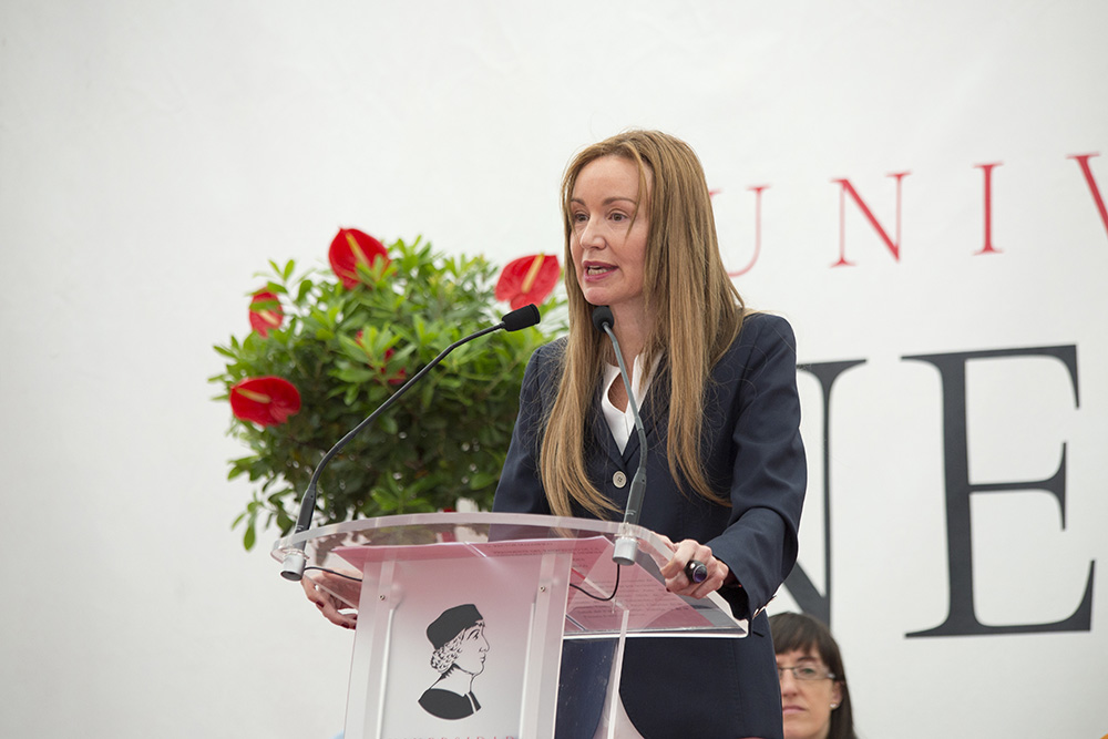 La madrina Loreto Ordoñez animó a los egresados en “la dura y excitante etapa laboral”. Además quiso transmitir esperanza por el futuro junto al sacrificio y las ganas de trabajar necesarias para tener éxito en cualquier carrera profesional. Ordoñez aconsejó a los alumnos que se diferenciaran de la competencia por su formación: “No dejéis de formaros porque os ayudará a adaptaros a los cambios del mercado”. Para la madrina de la promoción, hoy en día es fundamental “la marca personal ligada a vuestras fortalezas y saber trabajar en equipo”.