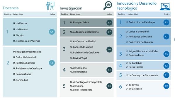 Esta última edición del U-Ranking ha analizado, de 61 universidades españolas, los parámetros de docencia, investigación e innovación y desarrollo tecnológico.