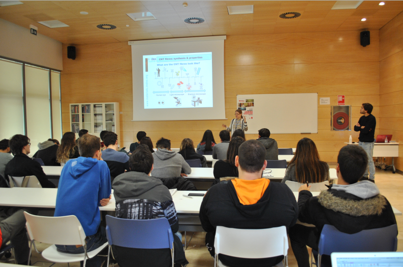 La investigadora postdoctoral, Anastasia Mikcalchan, hizo una exposición de su proyecto de investigación que se centra en la creación de una nueva generación de cables eléctricos e hilos multifuncionales procedentes del gas natural. Acompañados por Xaquin Rodiles, investigador predoctoral del mismo proyecto, pudieron ver in situ el reactor que utilizan para la creación de estos hilos de última generación.