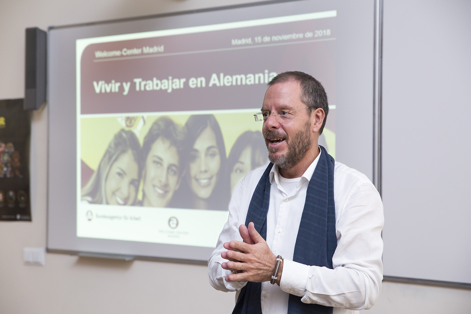 La Universidad Nebrija recibió la visita de Felipe Negrillo, de Welcome Centre Madrid, un proyecto común de la Agencia Federal de Empleo en Alemania y del Servicio Público de Empleo Estatal. Negrillo explicó a los alumnos asistentes, en una conferencia bajo el nombre “Trabajar y vivir en Alemania”, que Welcome Cente Madrid es un centro de información y orientación para personas tanto de Alemania como de España que buscan un puesto de trabajo o una Formación Profesional Dual en el país germano.