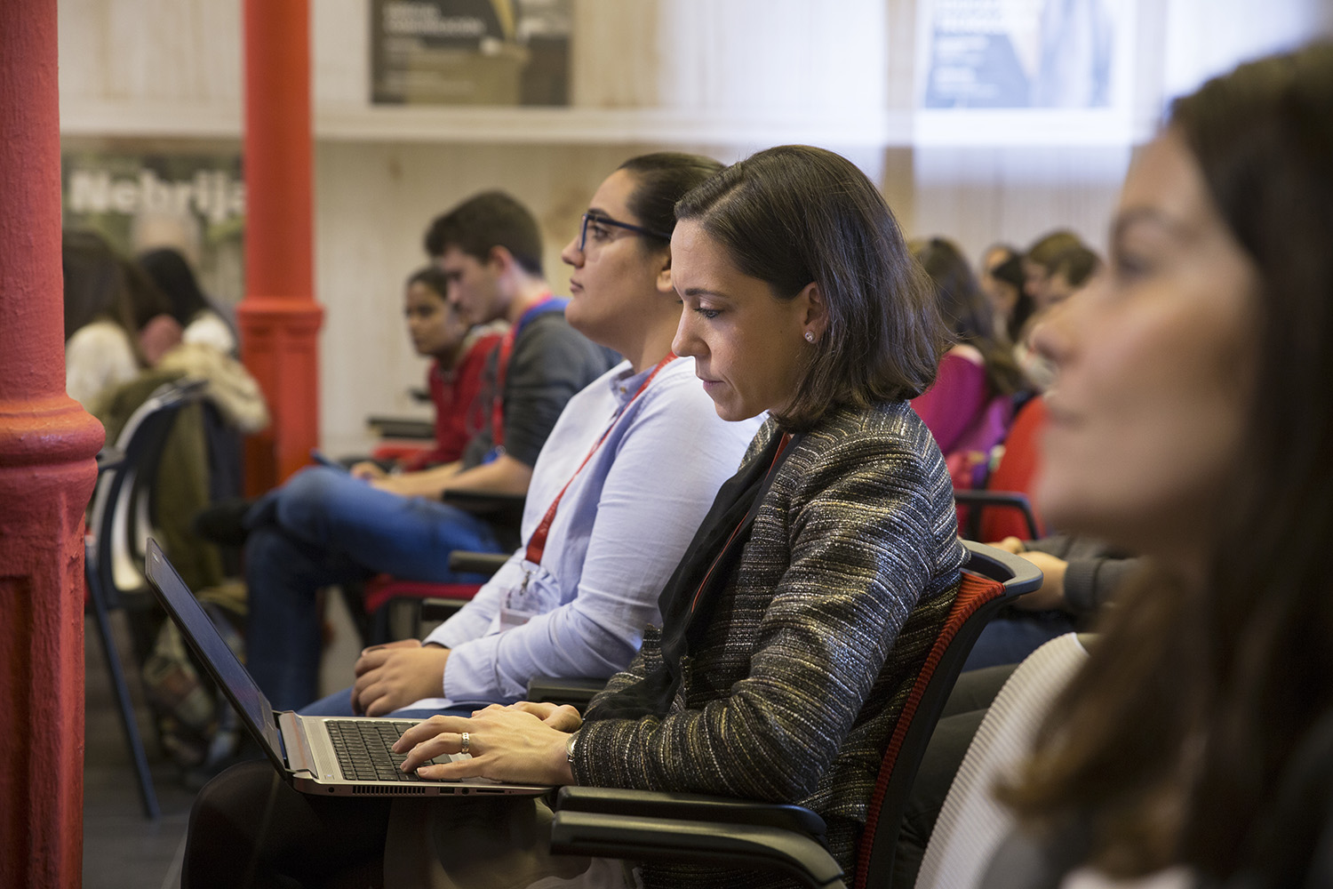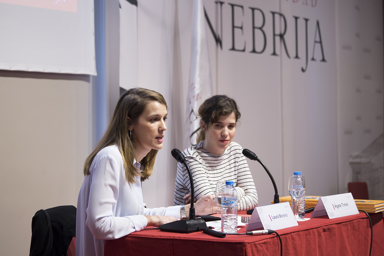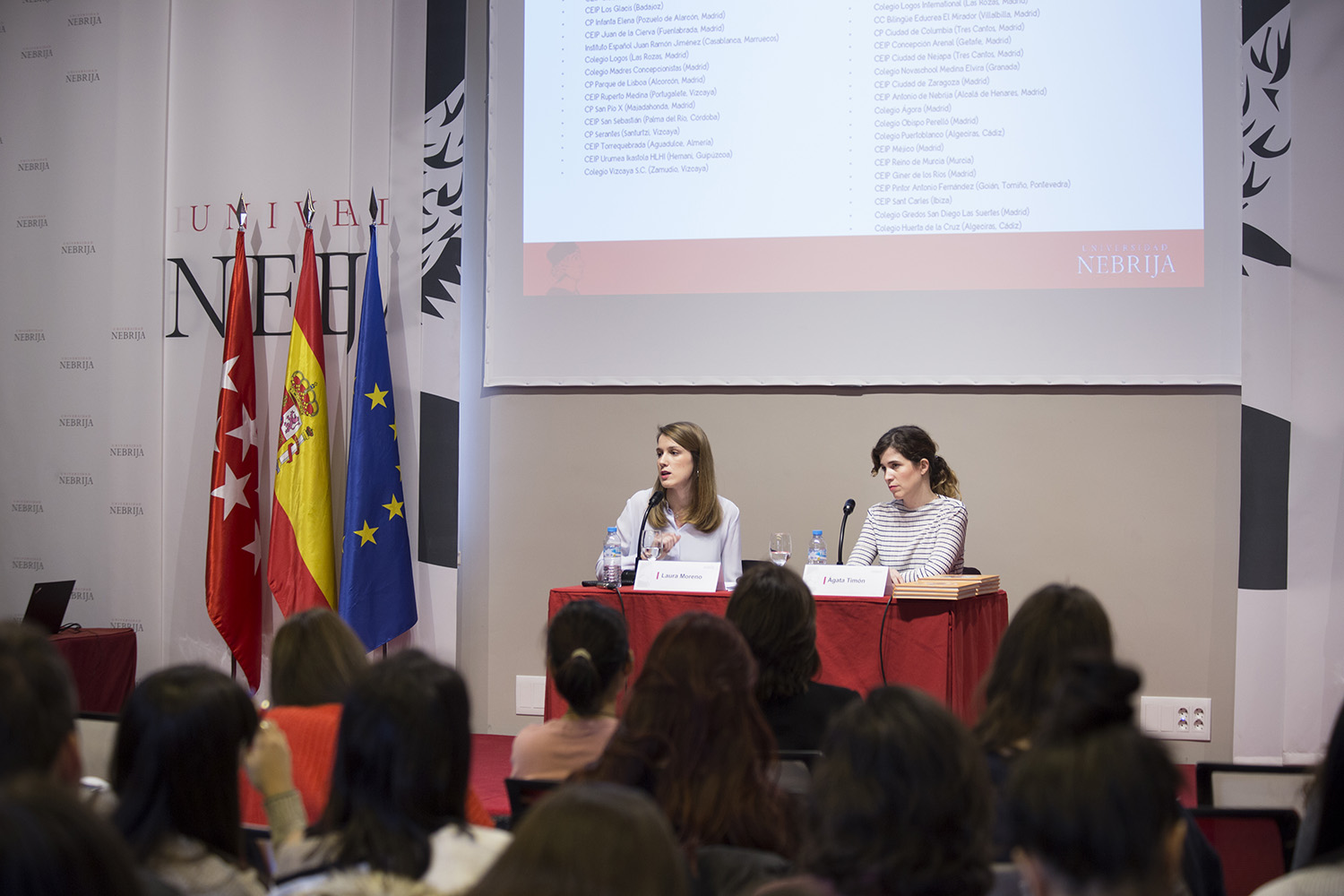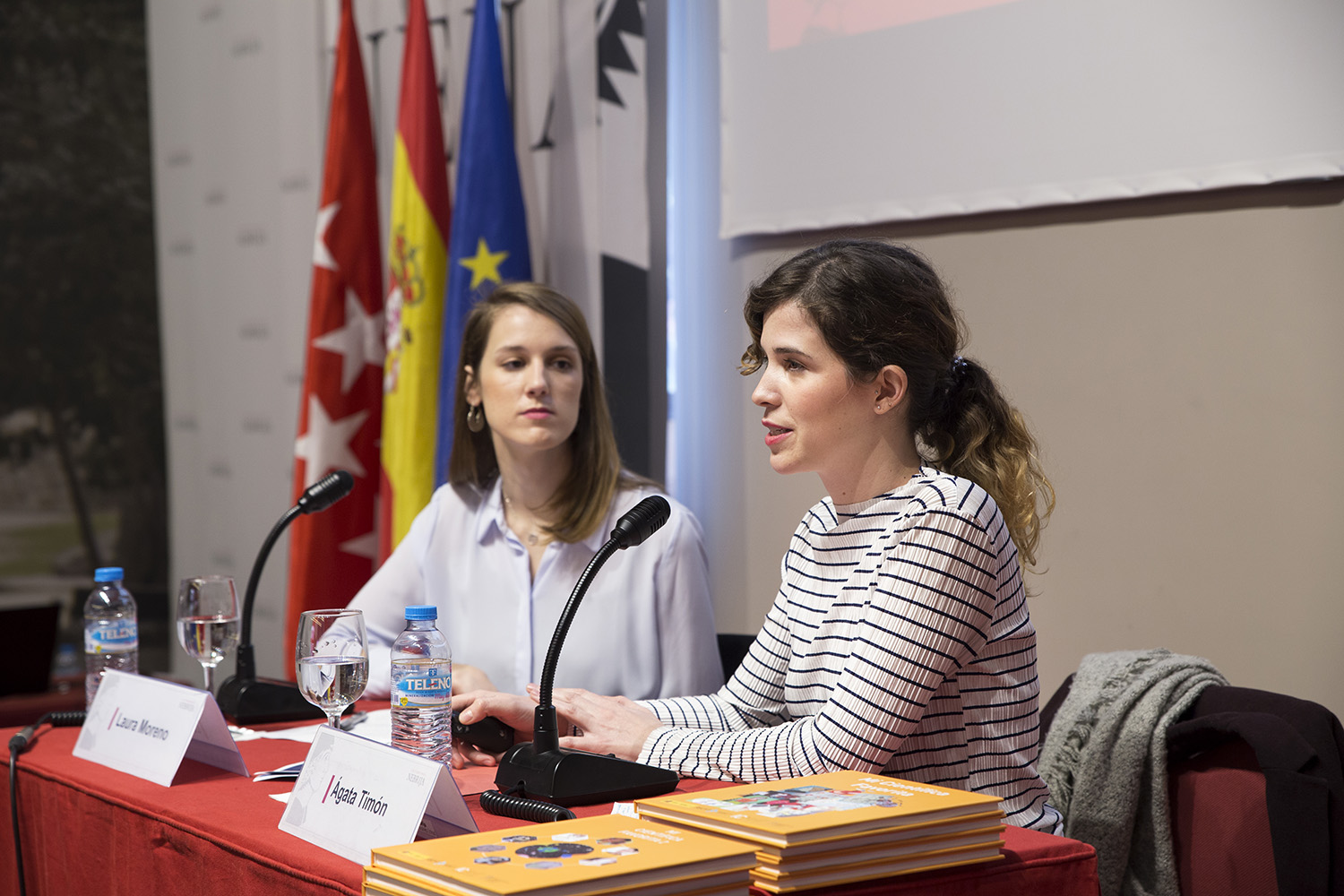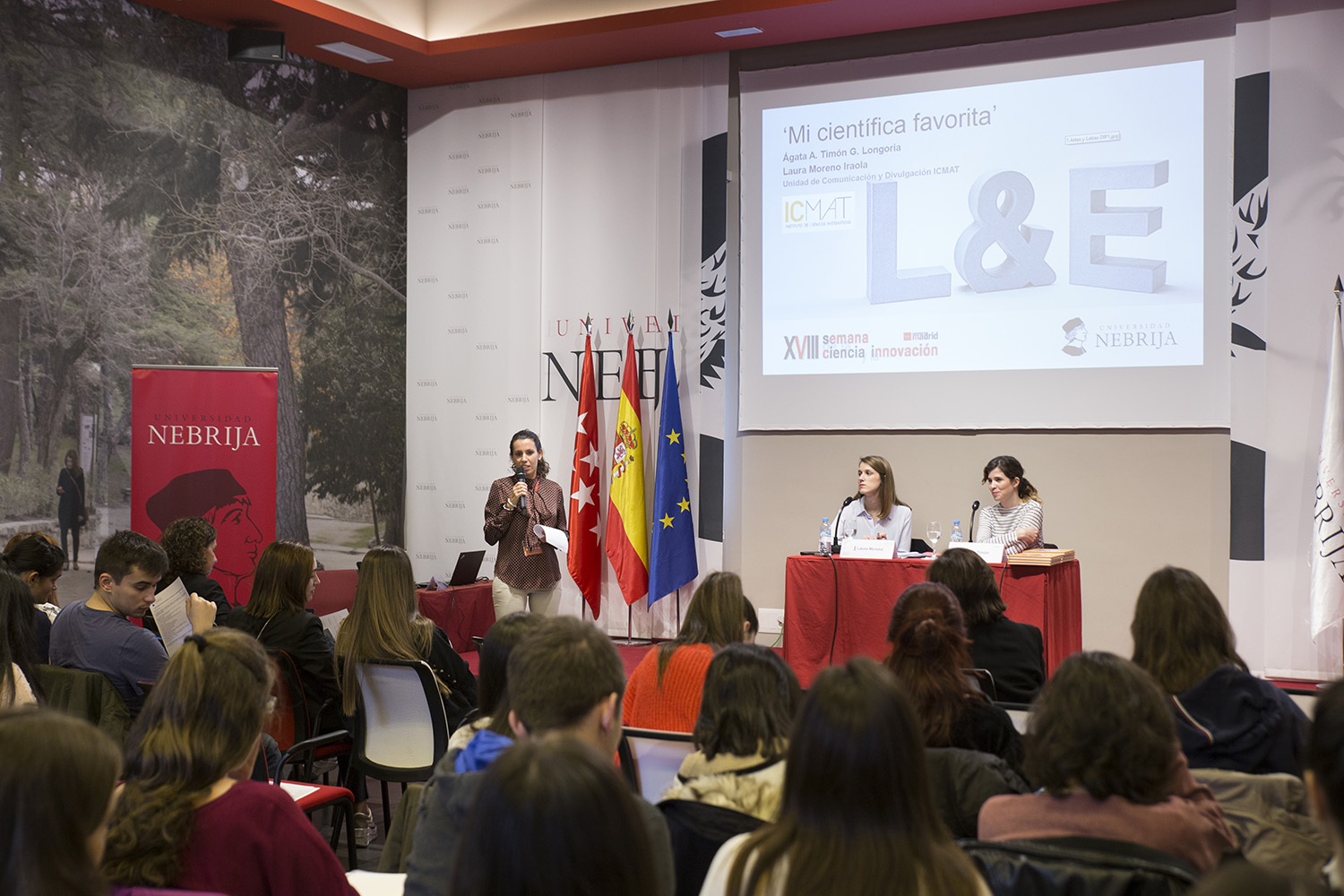 La primera conferencia fue ofrecida por la Unidad de Comunicación del Instituto de Ciencias Matemáticas (ICEMAT), Laura Moreno y Ágata Timón, quienes presentaron el libro Mi científica favorita que recoge trabajos de alumnos de primaria sobre figuras científicas femeninas en las que se muestran interesados. El objetivo de esta publicación es visibilizar a las mujeres científicas desconocidas que no son recogidas en los libros de textos utilizados en los colegios y “mostrar que la ciencia no tiene género y es de todos y para todos”, explicó Laura Moreno. Los estudios muestran que los estereotipos se empiezan a forjar de los 10 a los 12 años, “por eso es la edad de los alumnos que participan en este proyecto que ya lleva dos ediciones”, dijo Ágata Timón.