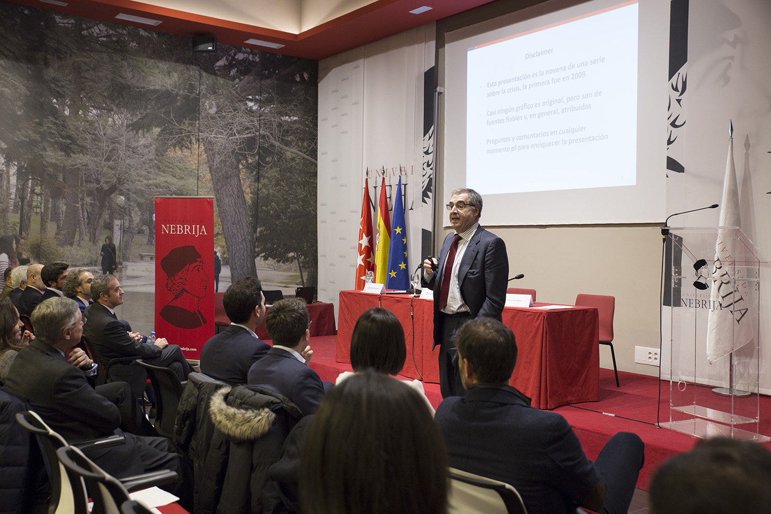 Tras la entrega del diploma, el economista Ignacio Sánchez-Asiaín, impartió una lección magistral sobre la crisis mundial vivida hace diez años y las consecuencias que ha dejado en la economía mundial y española. “La crisis acabó hace muchos años, pero ha hecho que el mundo cambie muy rápido” comenzó diciendo Sánchez-Asiaín. El economista explicó que se trató de una crisis de deuda, de apalancamiento del desarrollo de muchos países, “el sistema financiero estaba desbordado en la búsqueda de beneficio cuando empezó la crisis”. Una vez pasada la crisis los países han comprendido la necesidad de tener más prudencia en las tasas de crecimiento de algunos sectores como el financiero y a “aprovechar las épocas de crecimiento para crear un colchón de ahorro para cuando vuelva a venir otra crisis.”