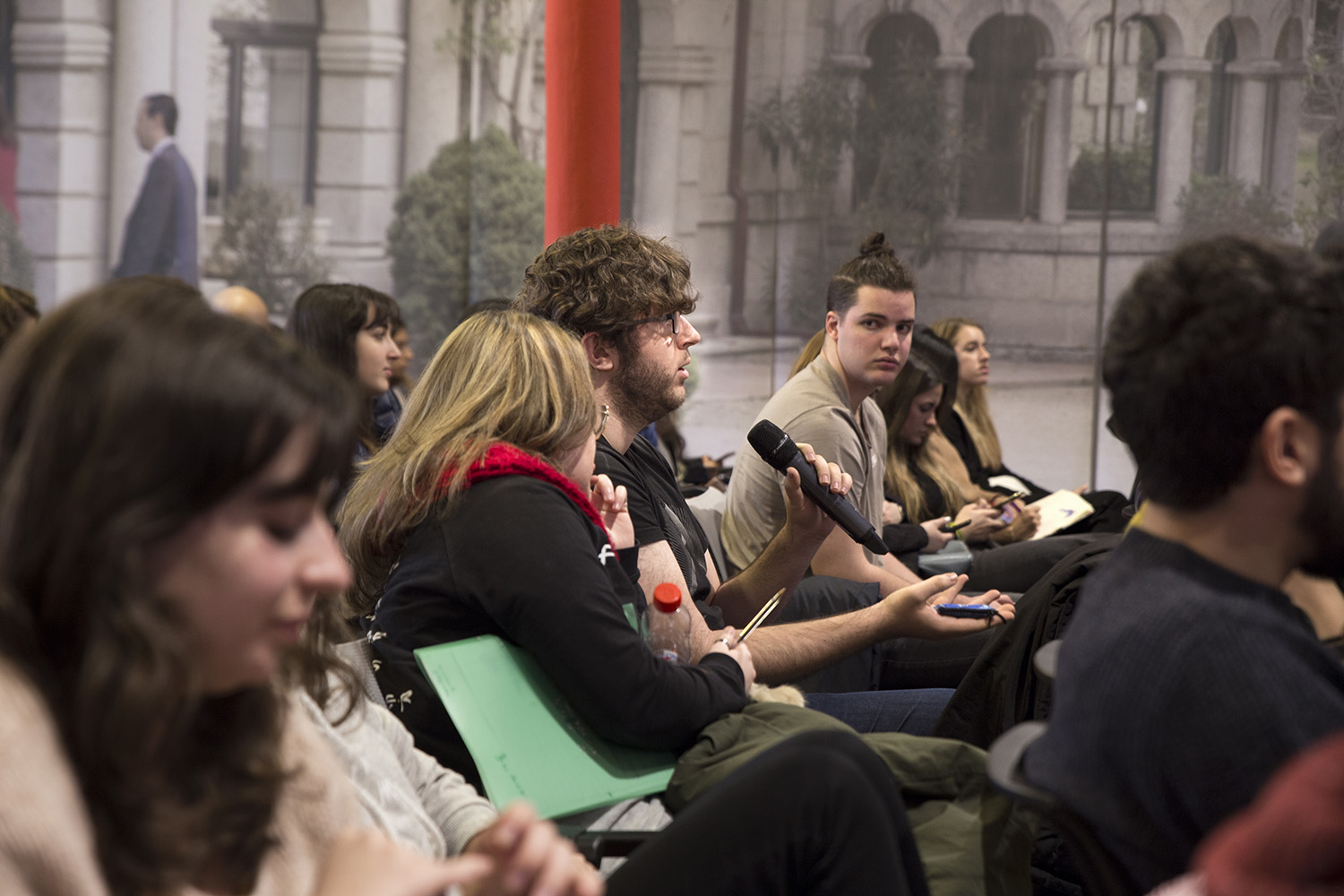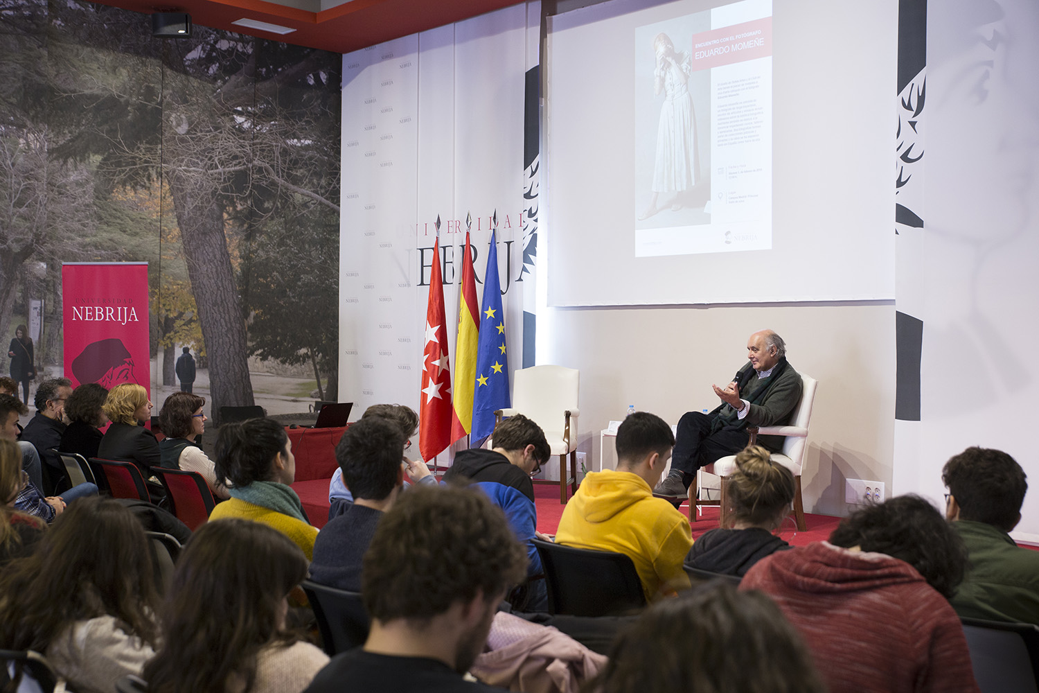 Los alumnos se interesaron mucho por la opinión del fotógrafo respecto a algunos temas ligados a la edición de la fotografía actual o los diferentes formatos como el selfie del que dijo que “equiparar un selfie a una fotografía es como equiparar un mensaje de WhatsApp con literatura”. Respecto al cambio a la fotografía digital, Momeñe afirmó que “no viví el cambio de forma dramática”, sin embargo, en cuanto a la edición de la fotografía opinó que “esta deja de ser fotografía cuando está editada porque cambia el lenguaje utilizado, el soporte fotográfico no hace una fotografía, la hace el lenguaje”.