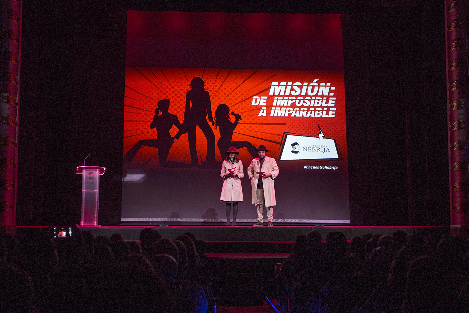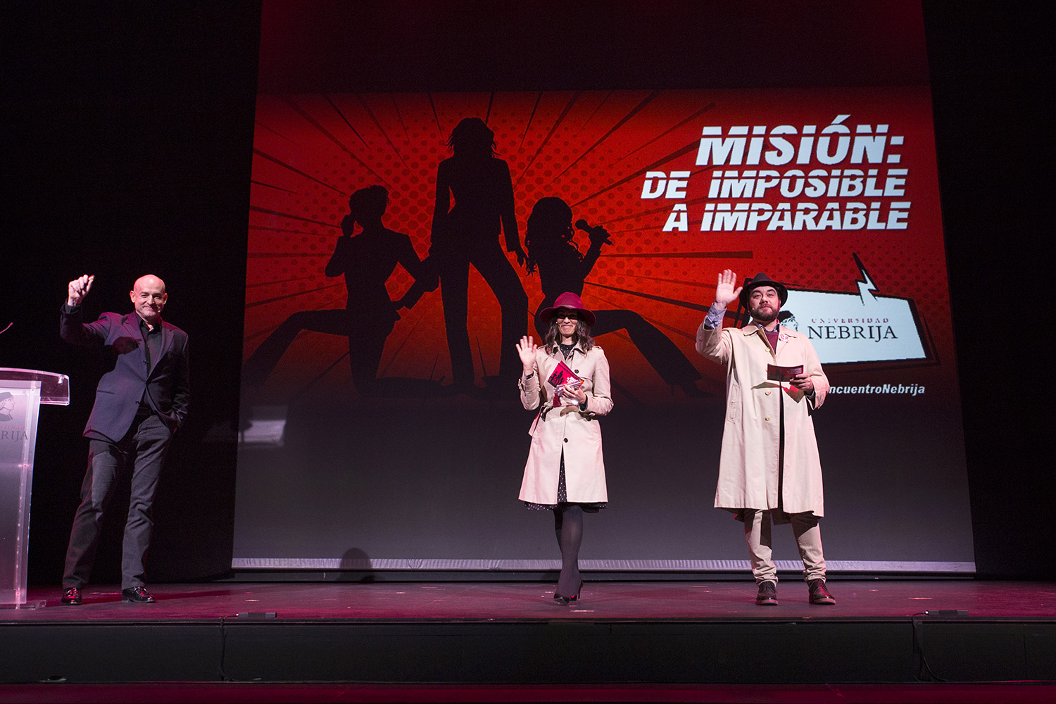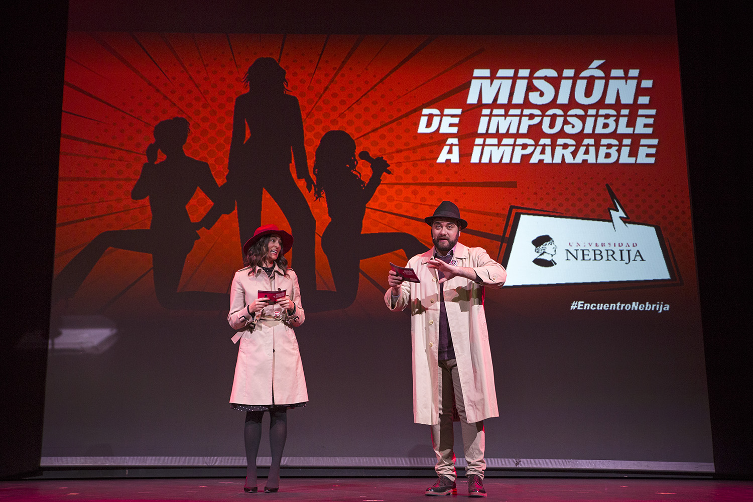 Los encargados de conducir el acto este año fueron Alicia de la Peña, directora de la Oficina de Proyección Profesional e Internacional y Nicolás Grijalba, director del Grado de Comunicación Audiovisual, quienes, siguiendo una historia detectivesca y con toques de humor, fueron guiando a los asistentes a lo largo del descubrimiento de los cuatro pilares fundamentales de la Universidad Nebrija: empleabilidad, exigencia académica, transversalidad e internacionalización.