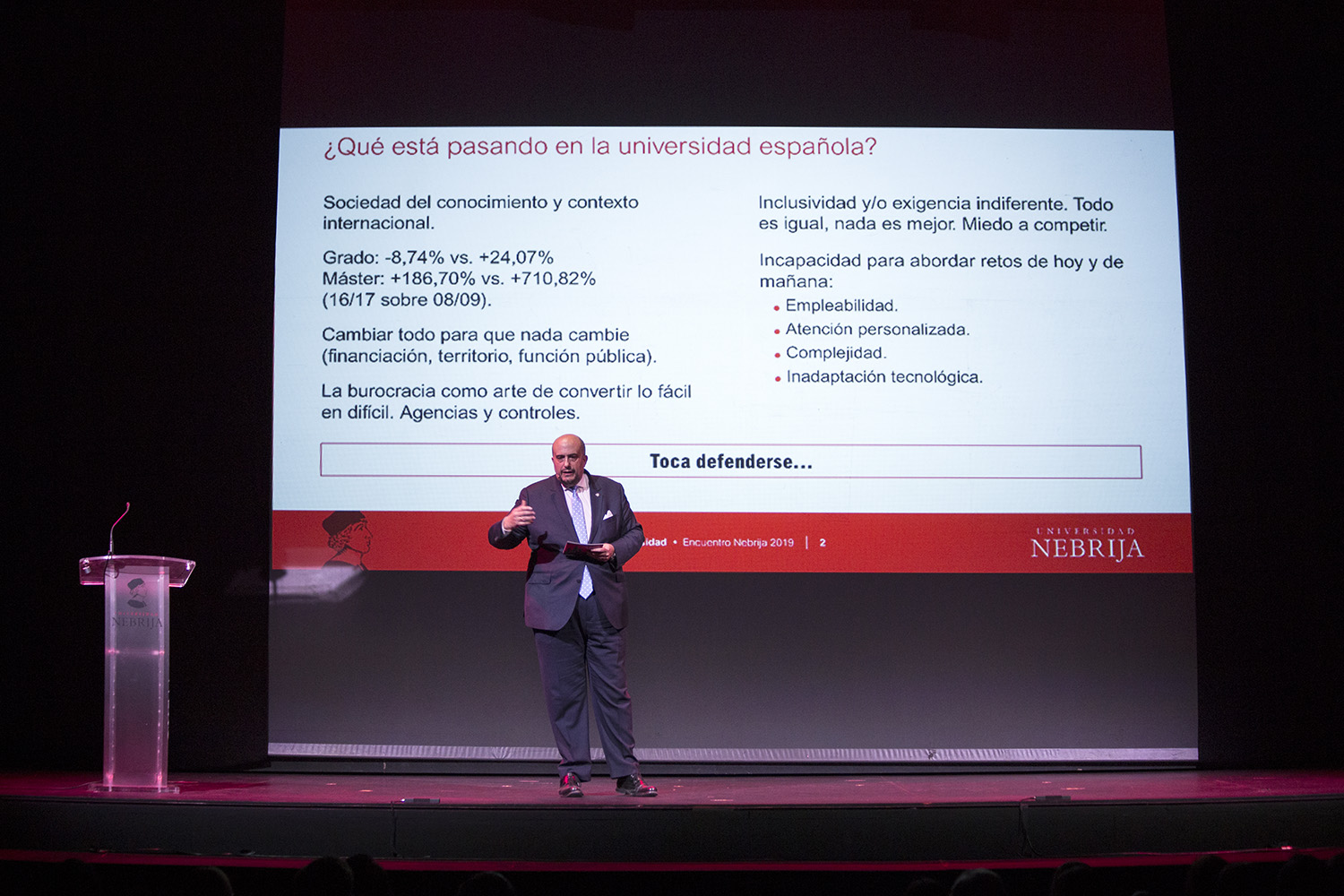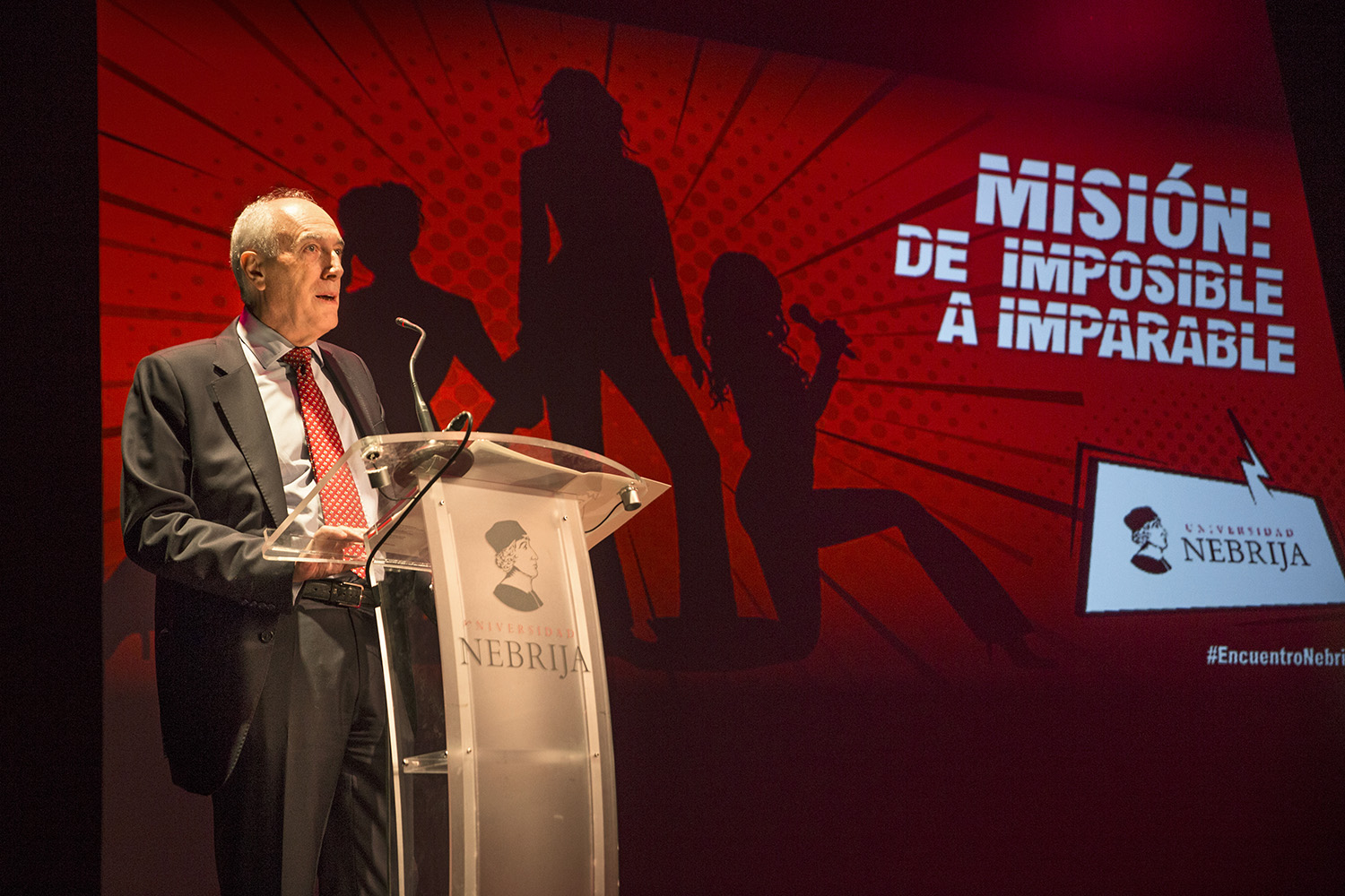 El presidente de la Fundación Antonio de Nebrija, Manuel Villa-Cellino, fue el primero en intervenir para expresar el principal objetivo de la Universidad dentro de la sociedad española: “Contribuir a la competitividad de nuestro país”. El presidente felicitó a todos los asistentes por el avance que ha realizado la Universidad: “Hemos sido reconocidos en los rankings de prestigio, se valora nuestra calidad docente y seguiremos aumentando la enorme capacidad de tracción que genera nuestra Universidad. Estamos en un buen momento y eso es gracias al esfuerzo de todos ustedes”, dijo dirigiéndose al público.