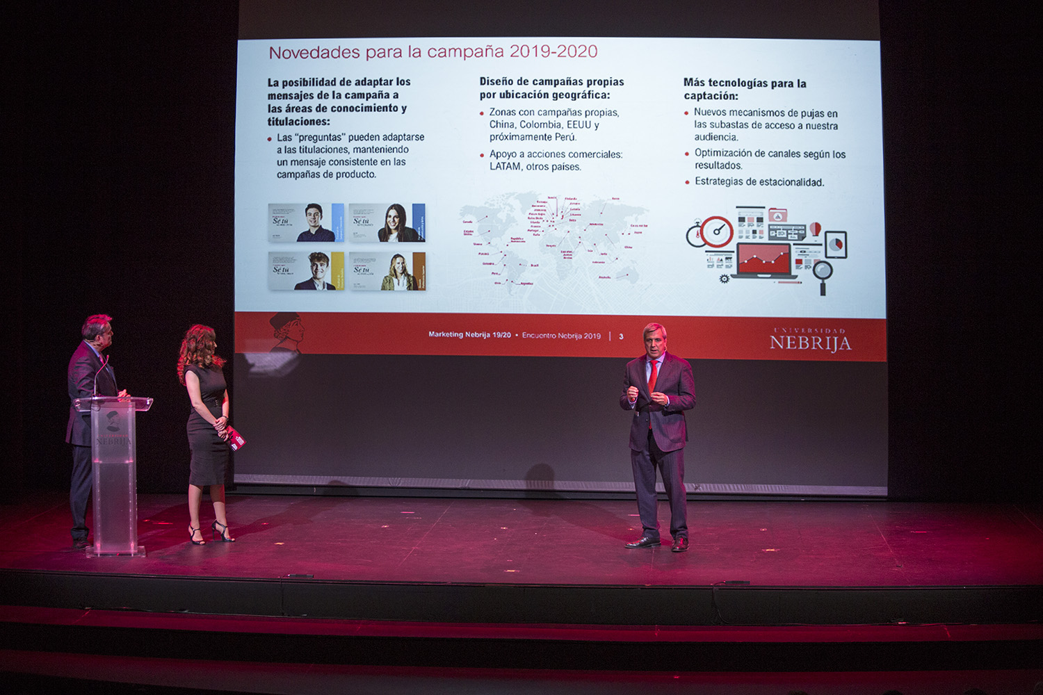 El director de Planificación Estratégica, Juan Antonio Escarabajal, salió al escenario con Enrique Sotto, director de Marketing y María Gil, directora de Comunicación. Juntos dieron a conocer los detalles de la próxima campaña publicitaria de la Universidad, la planificación de medios en los que se encontrará esta campaña y los objetivos y acciones de comunicación que acompañarán a los de marketing para seguir extendiendo el prestigio de la Universidad Nebrija.