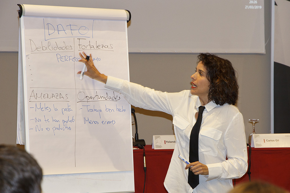 Otro de los ejercicios propuestos en el taller por parte de Yolanda López fue hacer un análisis DAFO de cada uno para conocerse mejor. Con el DAFO se analizan las debilidades, las fortalezas, las oportunidades y las amenazas de cada persona, en este caso, para saber a qué hay que hacer frente, cómo encarar situaciones adversas y potenciar los puntos positivos que nos ayudan a diferenciarnos de nuestros competidores.