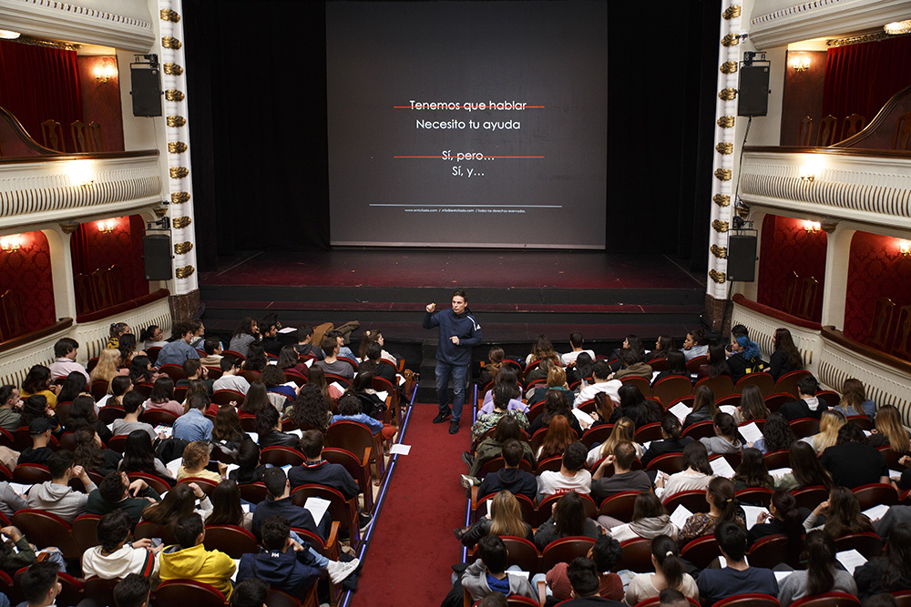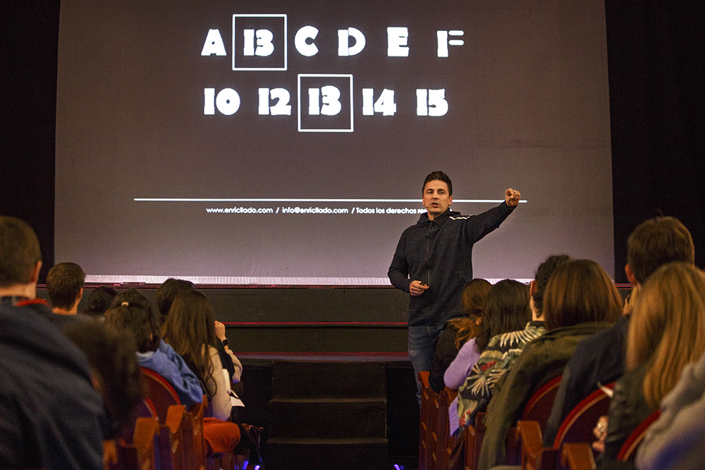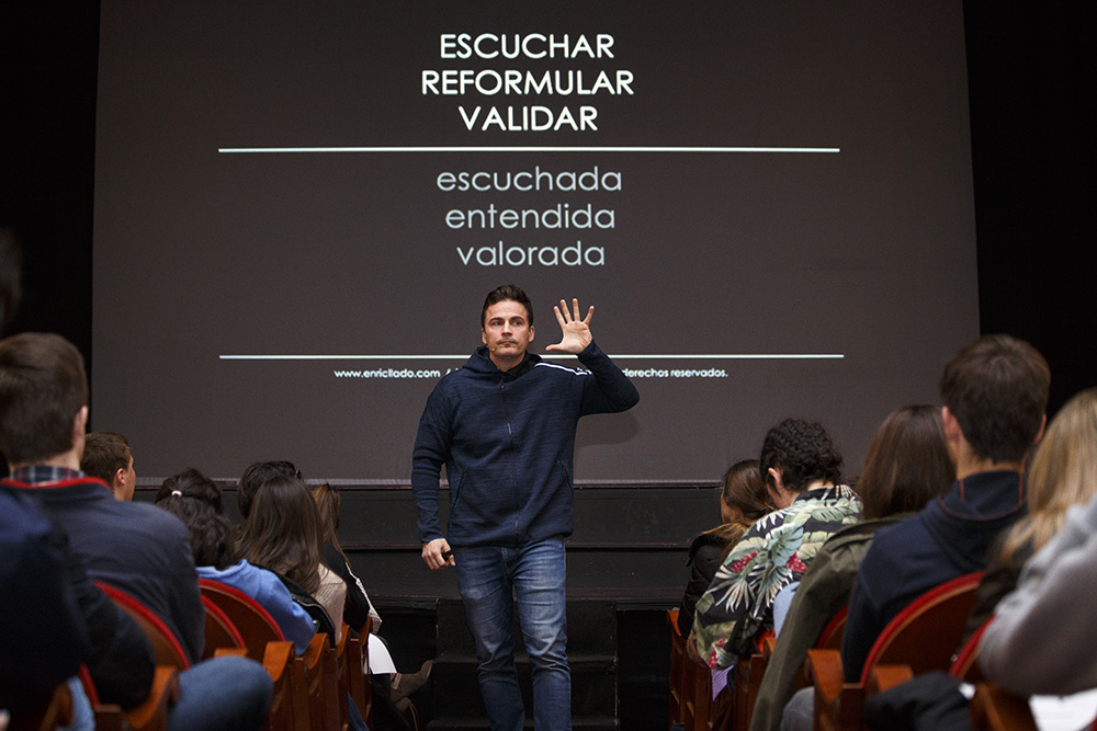 Otra de las claves que transmitió a los alumnos es que, cuando queremos convencer, menos siempre es más. “En comunicación, lo que no suma, resta. A menos palabras, más potencia”, destacó el experto, que insistió en que debemos aprender a hacer argumentos breves y potentes. También les aconsejo que escucharan “de verdad” a la otra persona para tener una comunicación eficiente: “Poned en silencio vuestra boca, vuestra mente y vuestro cuerpo”, apuntó Lladó,