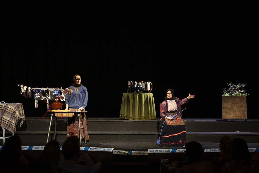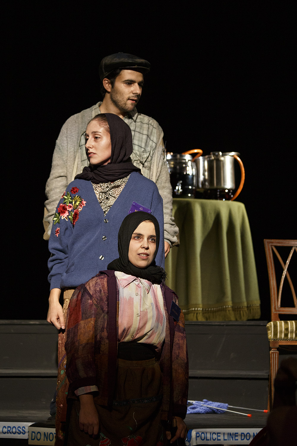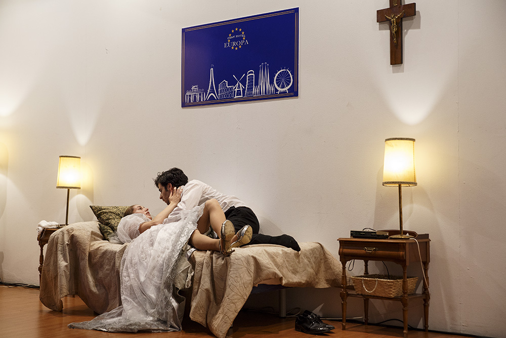 En el escenario del teatro nos recibe una de las familias de refugiados macedonios que se alojan en el Hotel Europa. Marta Palazón, representa a la suegra, María del Carmen Luque, interpreta a la mujer y David Martín al marido en una escena que muestra las dificultades que suponen los desplazamientos forzosos, la integración en un nuevo país y crear un nuevo hogar lejos de sus raíces. La caracterización de los personajes es muy convincente, pero en esta escena en concreto, junto a una iluminación muy acertada, se pueden ver en los rostros de los actores las penurias que atraviesan sus personajes.