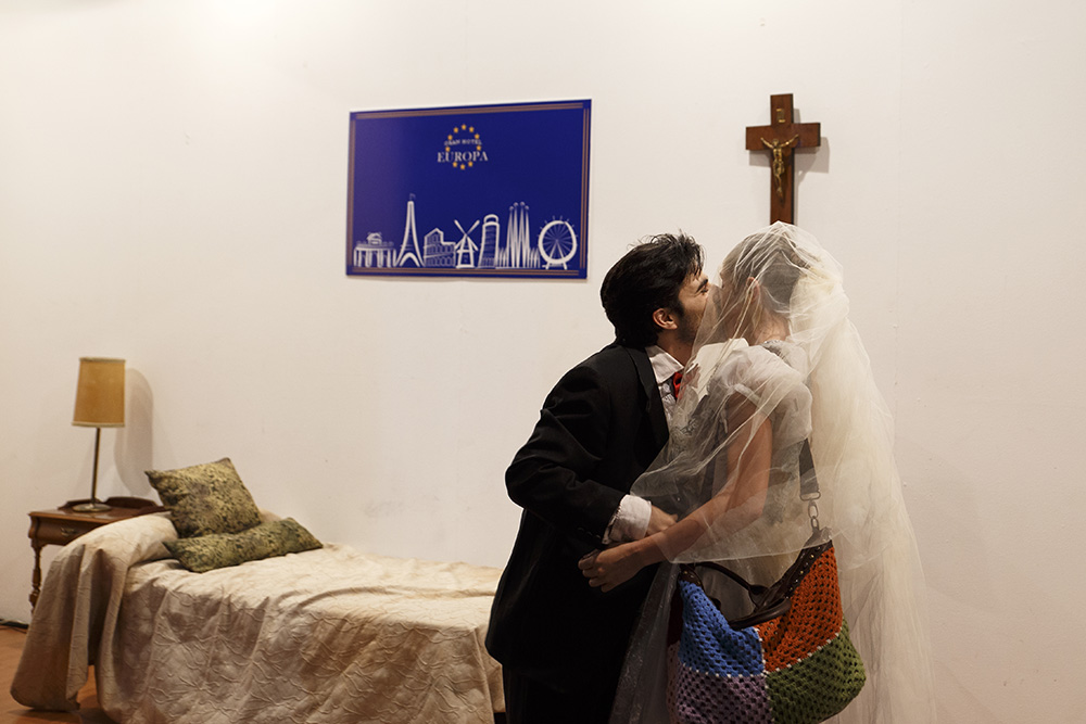 Una pareja de novios recién casados que han hecho autostop para llegar al hotel y disfrutar de “todo lo europeo”, un profesor que se enfrenta a la hermana de un hombre al que tuvo que asesinar, una trabajadora social que cree en una Europa mejor donde cabe todo el mundo, son algunos de los personajes que se encuentra el espectador a lo largo de la obra para reflejar la situación europea. La escena final, que transcurre en otra sala del teatro, representa un local de noche. Cuenta incluso con las actuaciones musicales de algunos de los actores, en la que destaca Ángela Mediero, interpretando a Ivana, una mujer que ha pasado por serias dificultades y que se da cuenta de la hipocresía con la que su pareja quiere hacer negocio a raíz de los inmigrantes. Tanto en los momentos en los que tiene diálogo, como en los que se encuentra en un segundo plano, Mediero sigue metida en su personaje aportando credibilidad a la escena.
