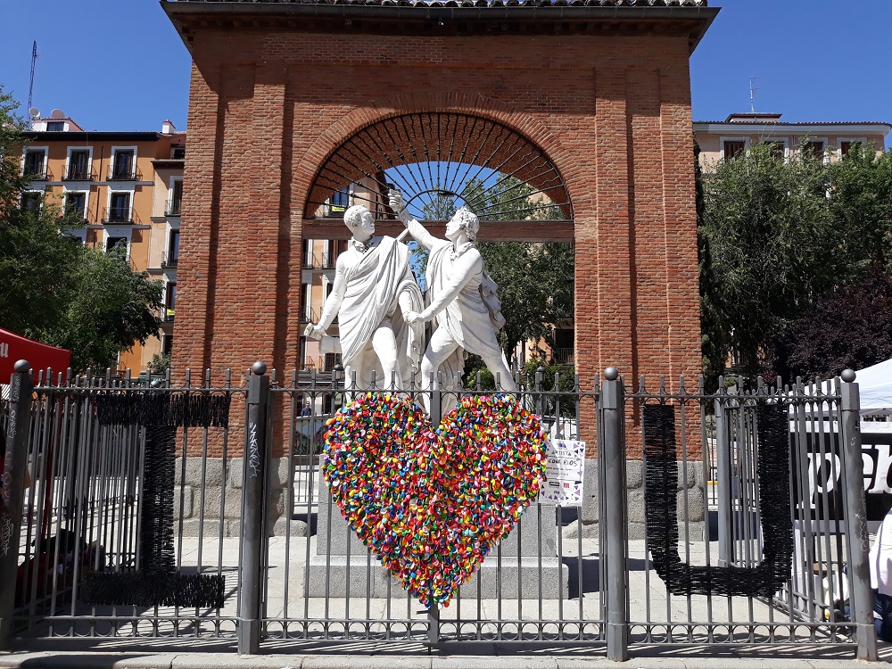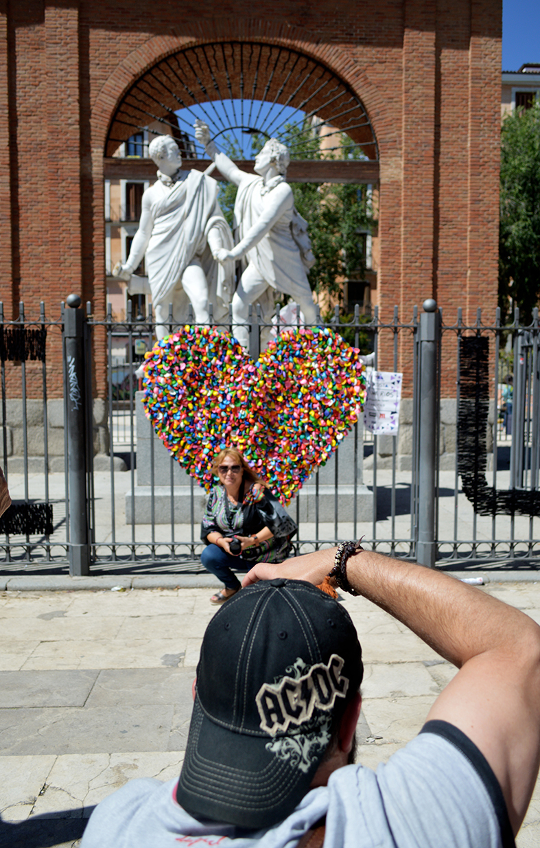 Basándose en el concepto del logo Milton Glaser, Cova Ríos se plantea una intervención acoplable a la reja del monumento de la plaza del 2 de Mayo, centro neurálgico de la zona. Un logo de amor del barrio a sus residentes y visitantes. #MalasañaLovesYou
