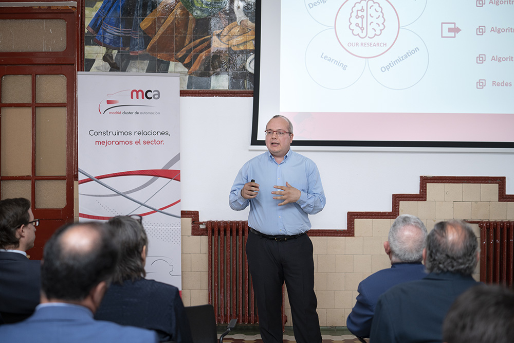 La jornada la han completado Sergio Corbera y Rafael Barea, investigadores de la Universidad Nebrija, cuyo grupo de investigación busca herramientas para automatizar el desarrollo de diseño de producto. En palabras del propio Corbera: “nos centramos en el desarrollo de las arquitecturas y agentes que deben existir en un teórico sistema futurible que sea inteligente y capaz de gestionar las decisiones que ahora toma el equipo de ingeniería por algoritmos matemáticos”.