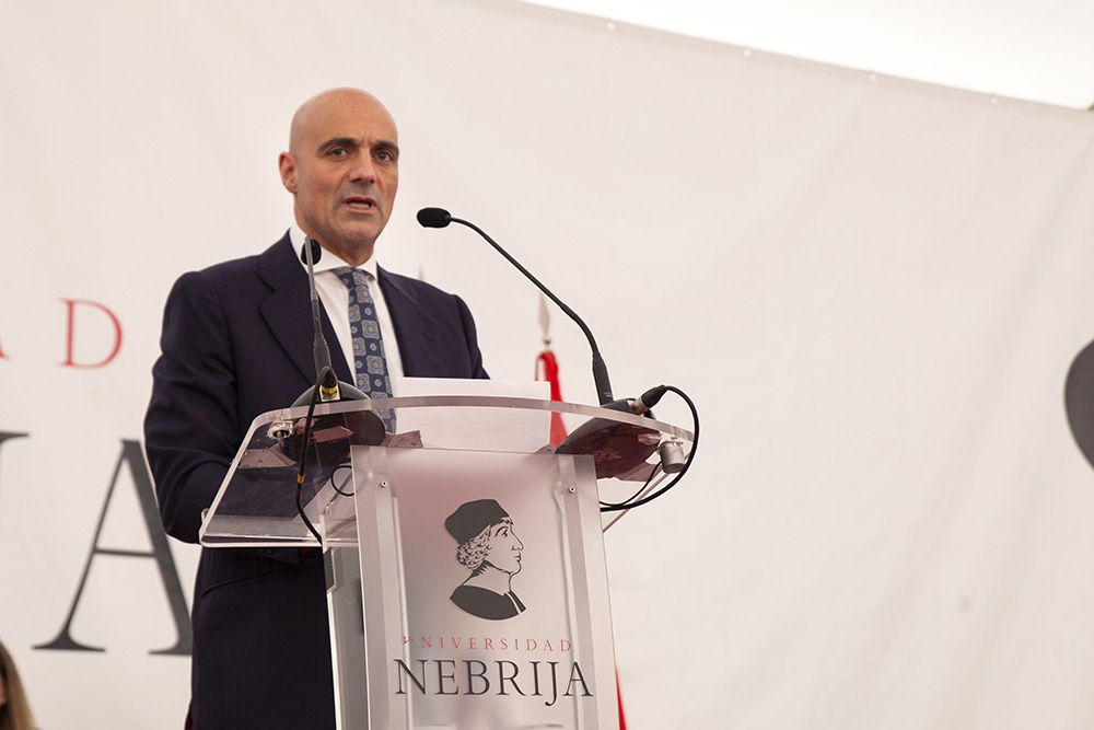 El padrino de los alumnos de grado fue Nicolás de Abajo, máximo responsable de I+D de ArcelorMittal, una de las cincuenta empresas más importantes del mundo y líder en innovación en el sector de la metalurgia. Nicolás de Abajo destacó la importancia de “ser valientes y esforzarse” para poder ver resultados en cualquier meta que se propongan y les animó a hacerse la pregunta “¿Queréis definir el mundo en el que vivís o queréis que hagan los cambios por vosotros?”. El padrino les aconsejó rodearse “de personas en las que confiéis y que crean en vosotros”. Para perder el miedo a comenzar en el mundo laboral les tranquilizó diciendo que “tenéis una formación extraordinaria, este enorme capital de conocimiento os hace libres. Os estábamos esperando y os necesitamos”.