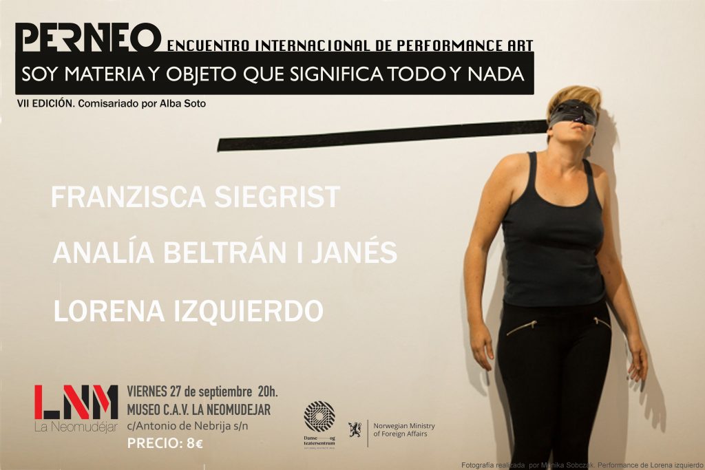 La profesora Alba Soto, comisaria de PERNEO Encuentros Internacionales de Performance Art, presenta la séptima edición en el Museo de la Neomudéjar de Madrid. En esta ocasión mostrarán su trabajo tres artistas de gran trayectoria, residentes en Noruega, Berlín y Madrid, Lorena Izquierdo, Franzisca Siegrist y Analía Beltrán.