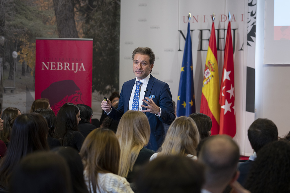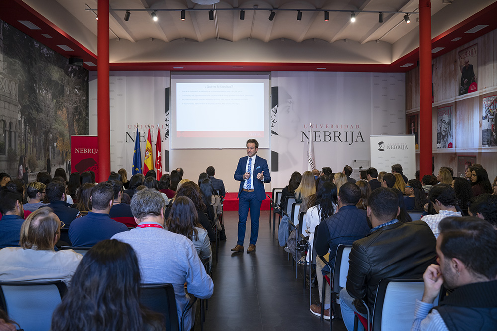 Fernando Tomé, decano de Ciencias Sociales de la Universidad Nebrija, no solo apuntó grandes cifras sino que dio consejos y avisos para que los alumnos de los másteres de la Facultad, que llenaban el salón de actos de Madrid-Princesa, tomaran buena nota: “Invertiréis 1.500 horas de estudio pero también exprimiréis al máximo esta experiencia, esta época preciosa que comenzáis; que la vida entre nosotros sea lo más agradable posible”.