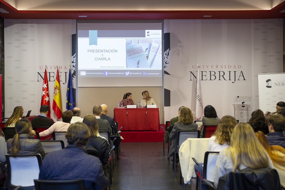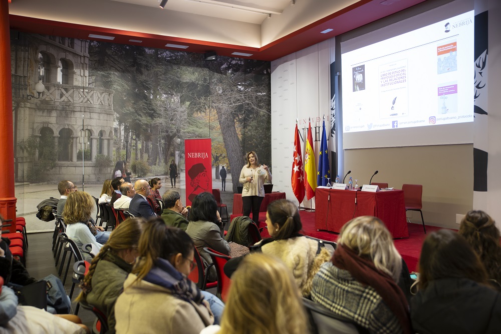 Al inicio de la conferencia-taller, Leticia Rodríguez Fernández, docente y directora del Grado en Comunicación Corporativa, Protocolo y Organización de Eventos de la Universidad Nebrija, alabó el tiempo, esfuerzo y dedicación de María del Carmen Portugal, “una institución en el ámbito del protocolo”, a la hora de escribir el libro de estilo.
