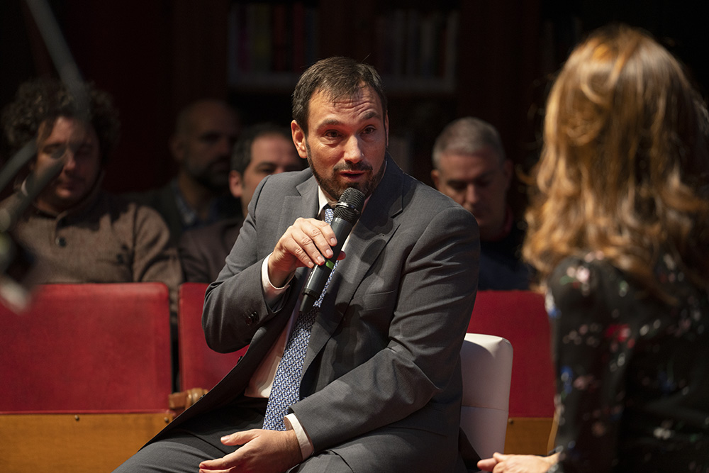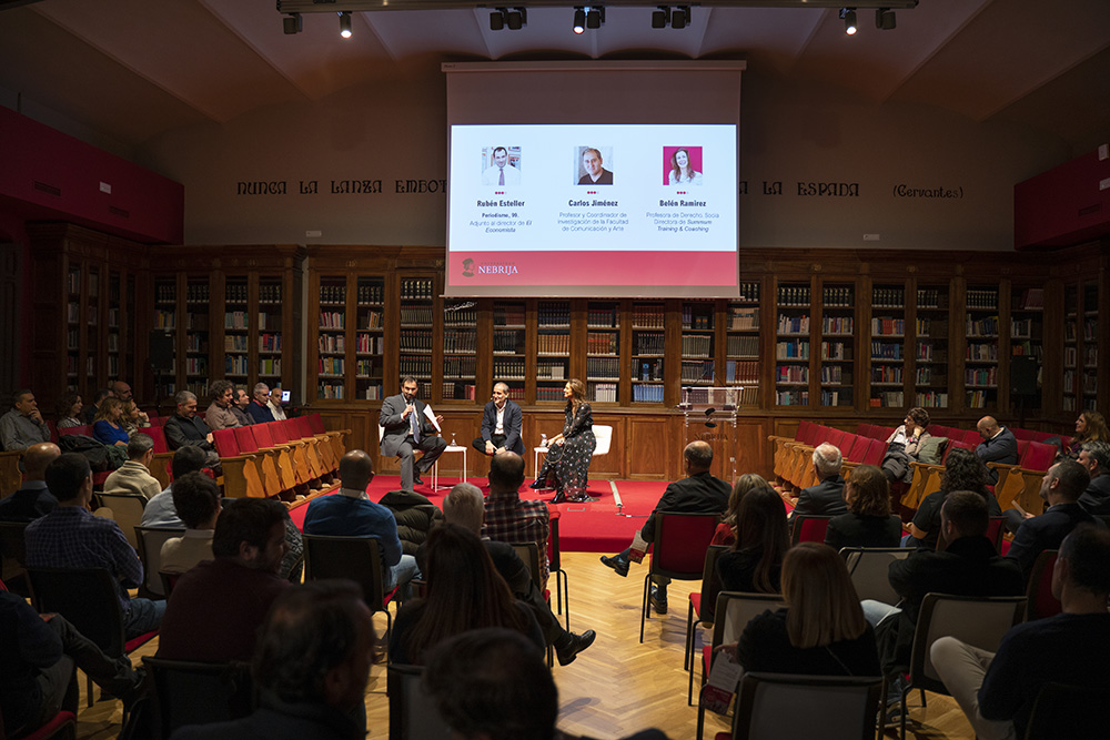 En la celebración hubo espacio para otros formatos, aparte de los discursos o los monólogos creativos. Rubén Esteller entrevistó a Carlos Jiménez, profesor y coordinador de Investigación de la Facultad de Comunicación y Arte, y Belén Ramírez, profesora de Derecho y socia directora de Summum Training & Coaching. El primero recordó a los estudiantes licenciados en 1999 como unos jóvenes “que tenían dotes de escucha”; además, “había un ambiente fantástico y la creatividad fluía”. En unos años en que “aún maquetábamos con el tipómetro y hablábamos de cíceros”, los profesores y los alumnos, como ocurre ahora, “nos sentíamos parte de un proyecto”. En otra mirada centrada en el presente, Carlos Jiménez aseguró: “La integración de Comunicación con Artes es un acierto y el crecimiento de la investigación, antes dormida, resulta excepcional. Realmente la Universidad Nebrija está deslumbrante y sigue apostando por el futuro”.