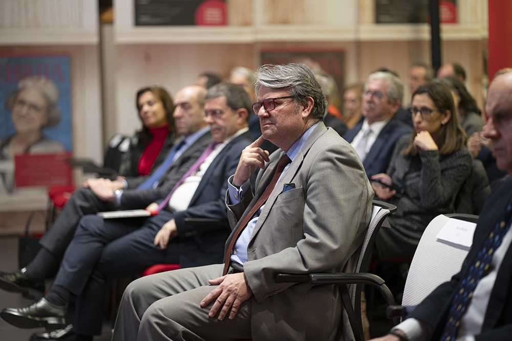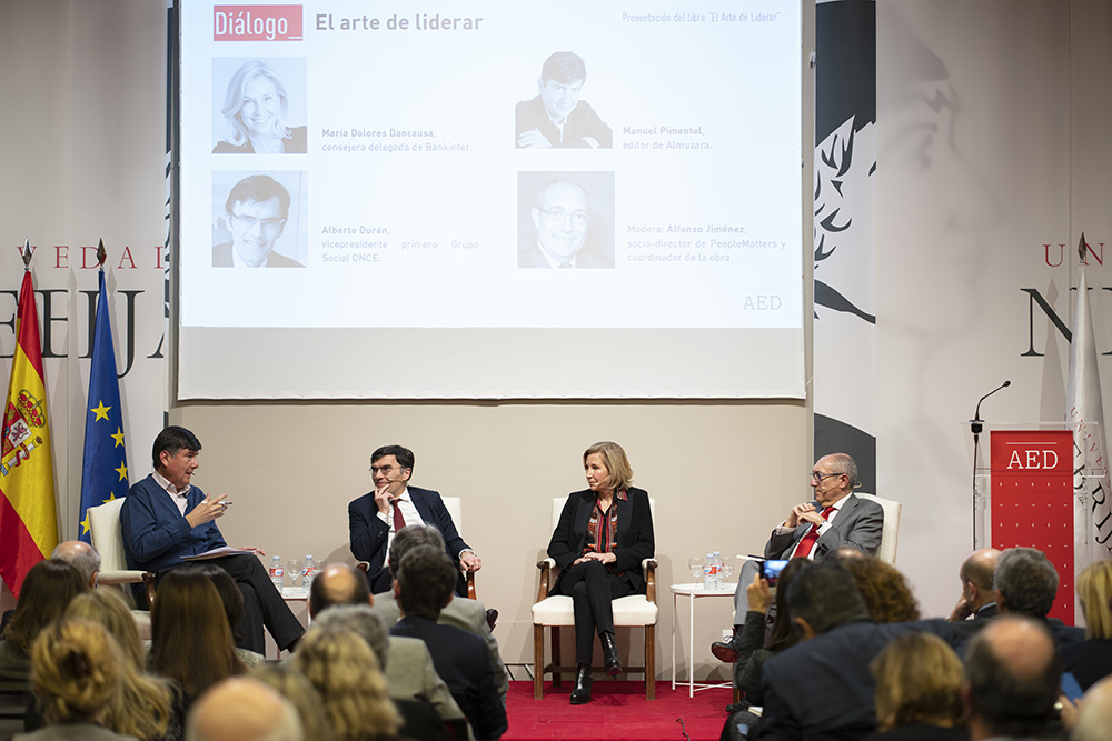 En la presentación se formó una mesa redonda con dos de los directivos entrevistados para la obra, el editor de Almuzara y Alfonso Jiménez. María Dolores Descansa, consejera delegada de Bankinter y Alberto Durán, vicepresidente primero del Grupo Social ONCE, respondieron a las preguntas junto a Pimentel.