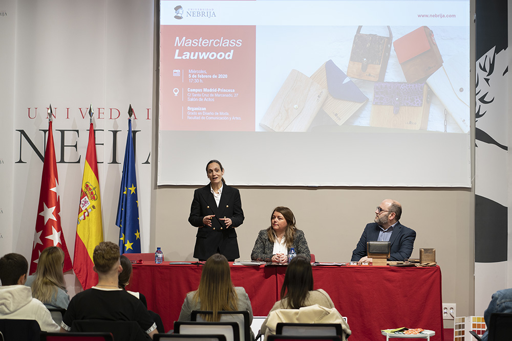 Laura Tapias es la fundadora y CEO de Lauwood, visitó la Universidad Nebrija para mostrar su marca a los alumnos del Grado en Diseño de Moda dentro del festival Madrid es Moda. Lauwood realiza bolsos combinando maderas, nacionales y exóticas, con diferentes tipos de pieles y otros tejidos innovadores. Tapias decidió emprender su propio negocio uniendo la moda y la tradición familiar: “Quise darle una vuelta a algo que había visto toda la vida en mi casa, las cajas, y crear algo nuevo y totalmente distinto”.