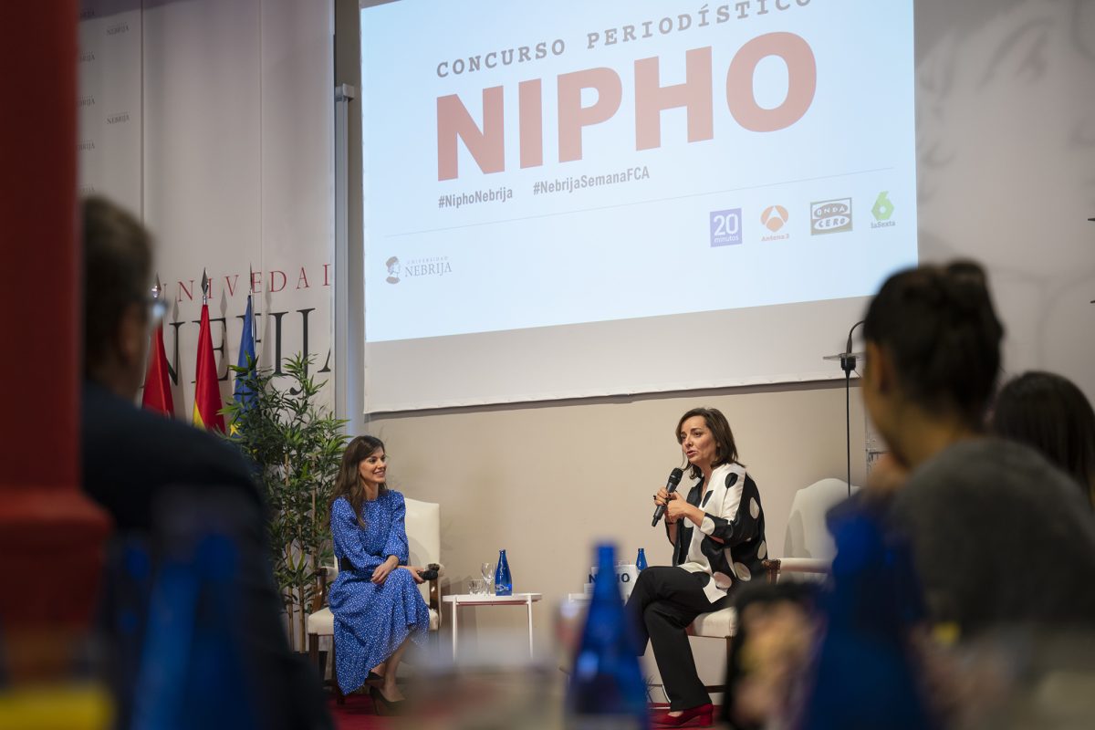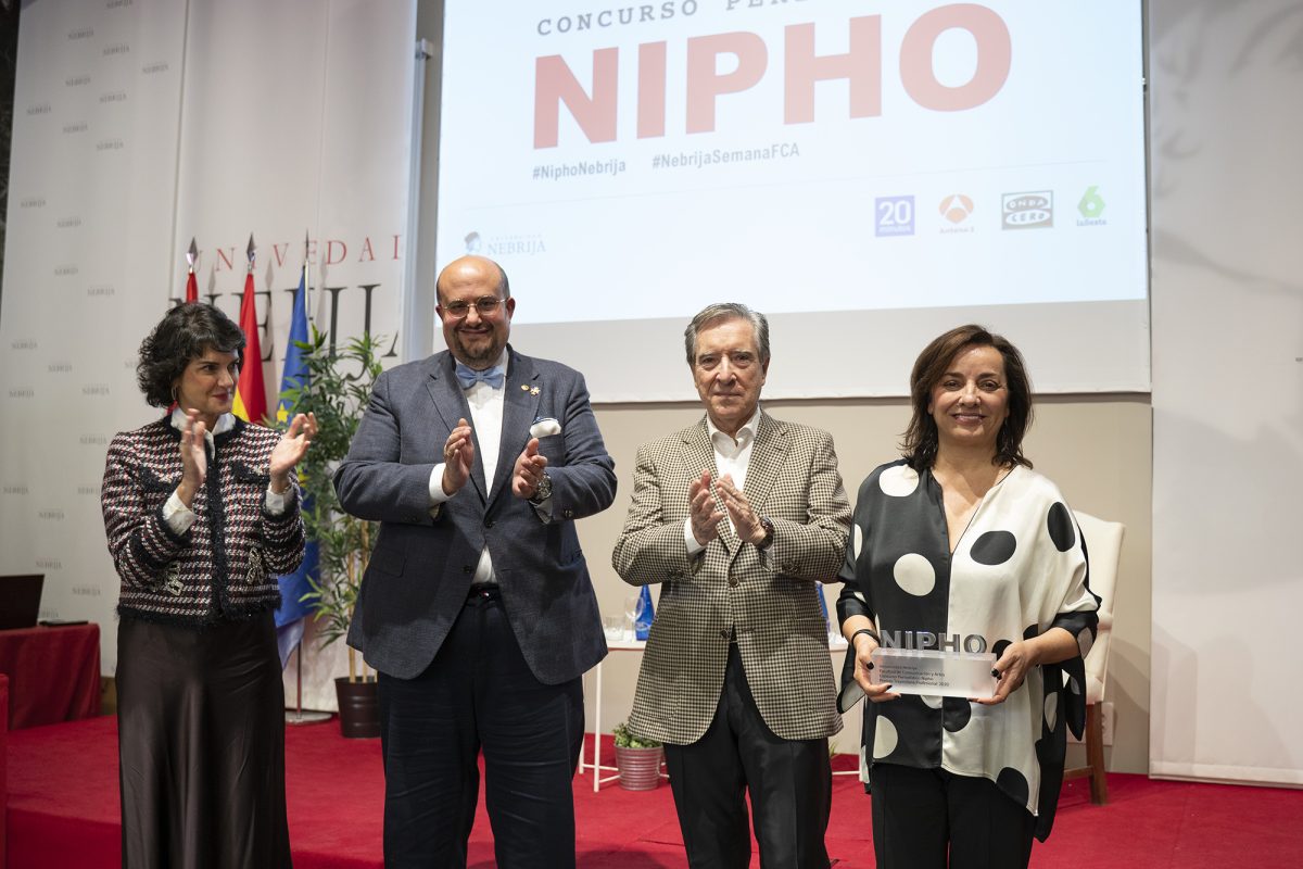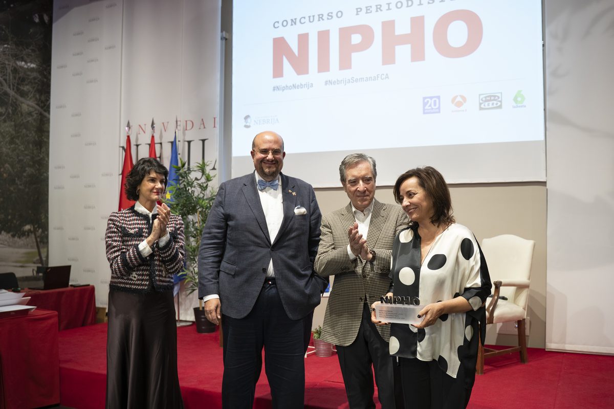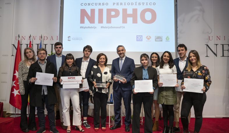 Juan Cayón, rector de la Universidad Nebrija; Marta Perlado, decana de la Facultad de Comunicación y Artes; y Pepa Bueno hicieron entrega de los premios NIPHO 2020. Ernesto García Ojeda ganó la categoría de Prensa y una beca de prácticas en 20 minutos. En Fotografía, el vencedor Andy Tavárez recibió una cámara fotográfica. En el apartado de Televisión se dirimieron dos premios, uno para grado y otro para posgrado. En el de grado, las becas de prácticas en Antena 3 recayeron en Rebeca Freire y Juan Ignacio Fernández Herruzo. En posgrado, Fernando Pedraza y Sara Trejo se alzaron con el galardón traducido en dos tabletas. El Premio Nipho de Periodismo Digital lo recogió Irene Martel. Por último, la categoría de Radio se dividió en dos premios. En grado, María Núñez disfrutará de una beca de prácticas en Onda Cero; en Posgrado, el ganador fue Alejandra Carril, que se llevó un iPad.