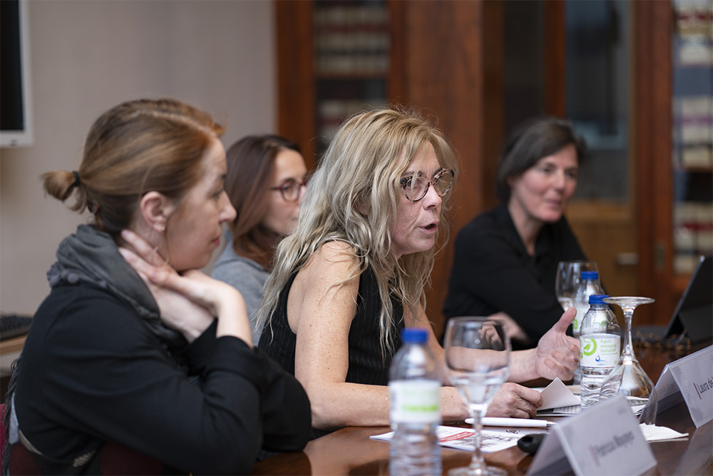 Mayayo estimó que las mujeres artistas “se enfrentan a una situación de precariedad” influida por los sesgos de género y “su doble papel en el ámbito productivo y reproductivo”. Por su parte, María Gimeno, creadora de performances e intervenciones artísticas de vanguardia, comentó su experiencia personal: “Yo tenía un escudo protector contra el feminismo hasta que me di cuenta de que libros como Historia del arte, de Ernst Gombrich, no hacían alusiones a las mujeres artistas”. En ese momento, “se me cayó la venda” –en la mesa redonda incluso lo mostró tirando una venda pintada con los ojos de su marido, que previamente se había puesto-. Gimeno instó también a superar la creación de cátedras de género para modificar los contenidos “desde los colegios hasta las universidades”.