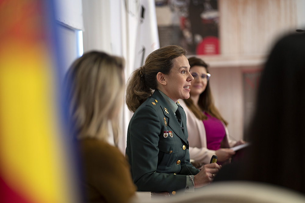 La presencia femenina en la Guardia Civil se circunscribe al 7,1% del total de agentes. Ese porcentaje se reduce al 3,5% de los oficiales y al 2,85% de los suboficiales. Con estos datos, Guillén evidenció la “poca presencia femenina” en la Benemérita: “No podemos perder la mitad de nuestro talento, porque esto merma nuestra misión”. Con el objetivo de dar la vuelta a esta realidad, la comandante enumeró algunos documentos internos como la Guía de conciliación, que ha llegado a la undécima edición, la Guía de uso no sexista del lenguaje (2017), el Protocolo de acoso laboral / acoso sexual / por razón de sexo y el Plan de igualdad. “Tenemos que ser referentes y dejarnos ver. La igualdad y la sensibilización no vienen por arte de magia, sino por la formación”, dijo.