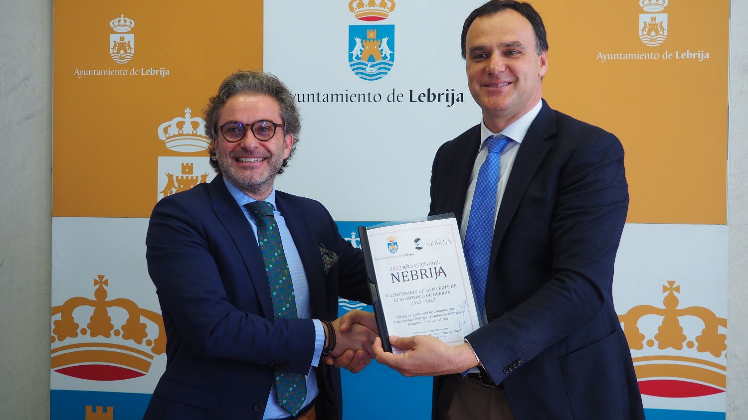 La Universidad Nebrija y la Fundación Antonio de Nebrija han firmado un convenio con el Ayuntamiento de Lebrija para la organización conjunta de actividades conmemorativas del V centenario de la muerte de Antonio de Nebrija. Han rubricado el acuerdo José Benito Barroso, alcalde de Lebrija, y Fernando Tomé, vicerrector de Estudiantes y Empleabilidad de la Universidad Nebrija y director de la Fundación Antonio de Nebrija.