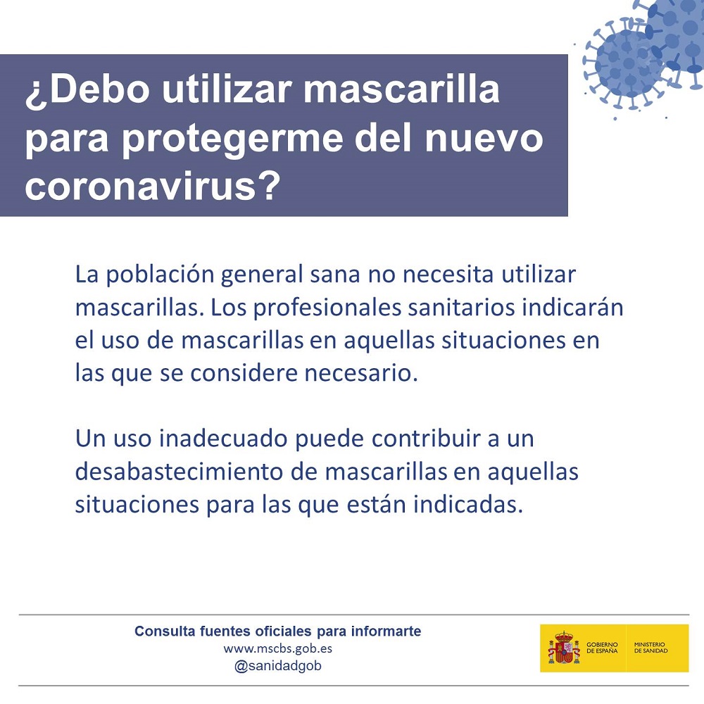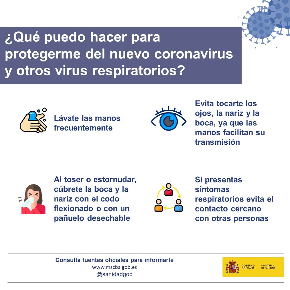 - Infografías del Ministerio de Sanidad sobre cómo protegerse, cómo lavarse las manos correctamente, cómo se transmite el coronavirus y recomendaciones ante viajes eventuales.
