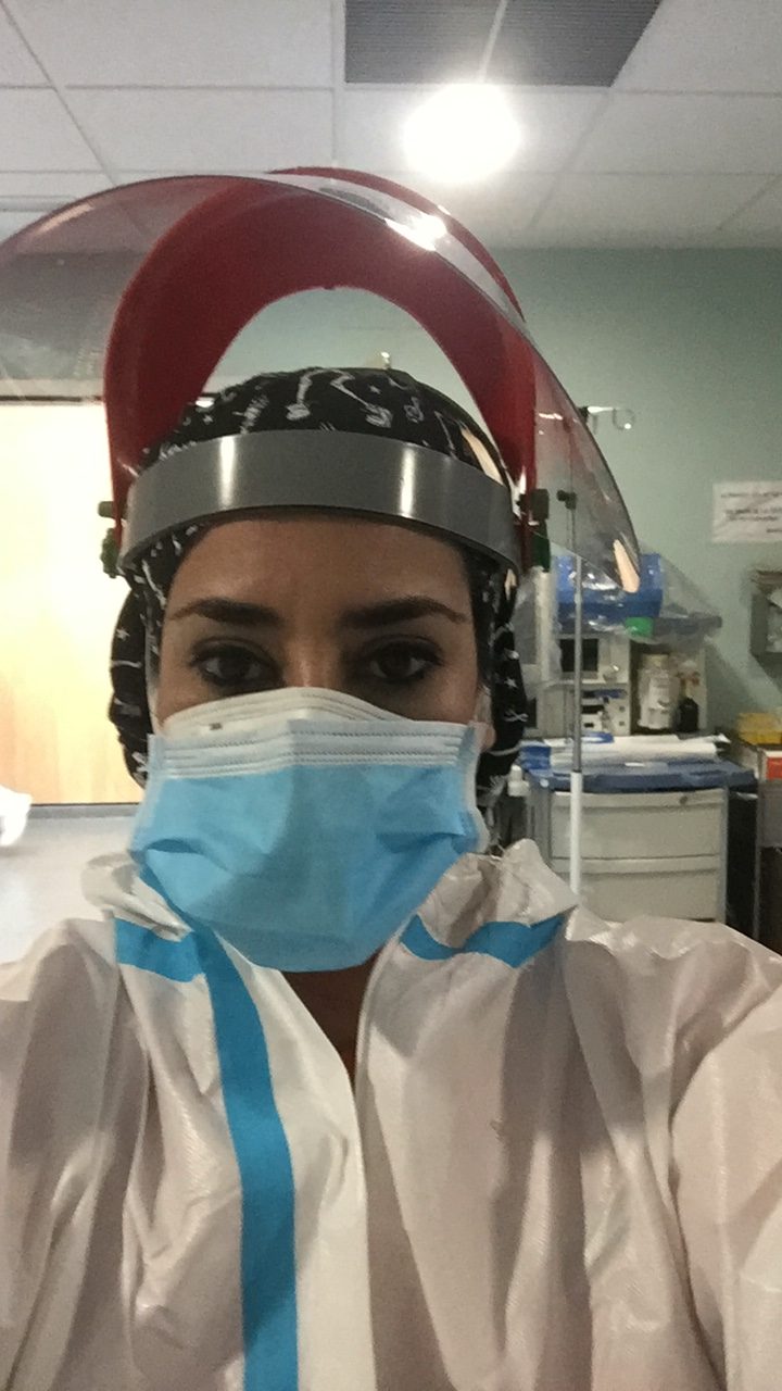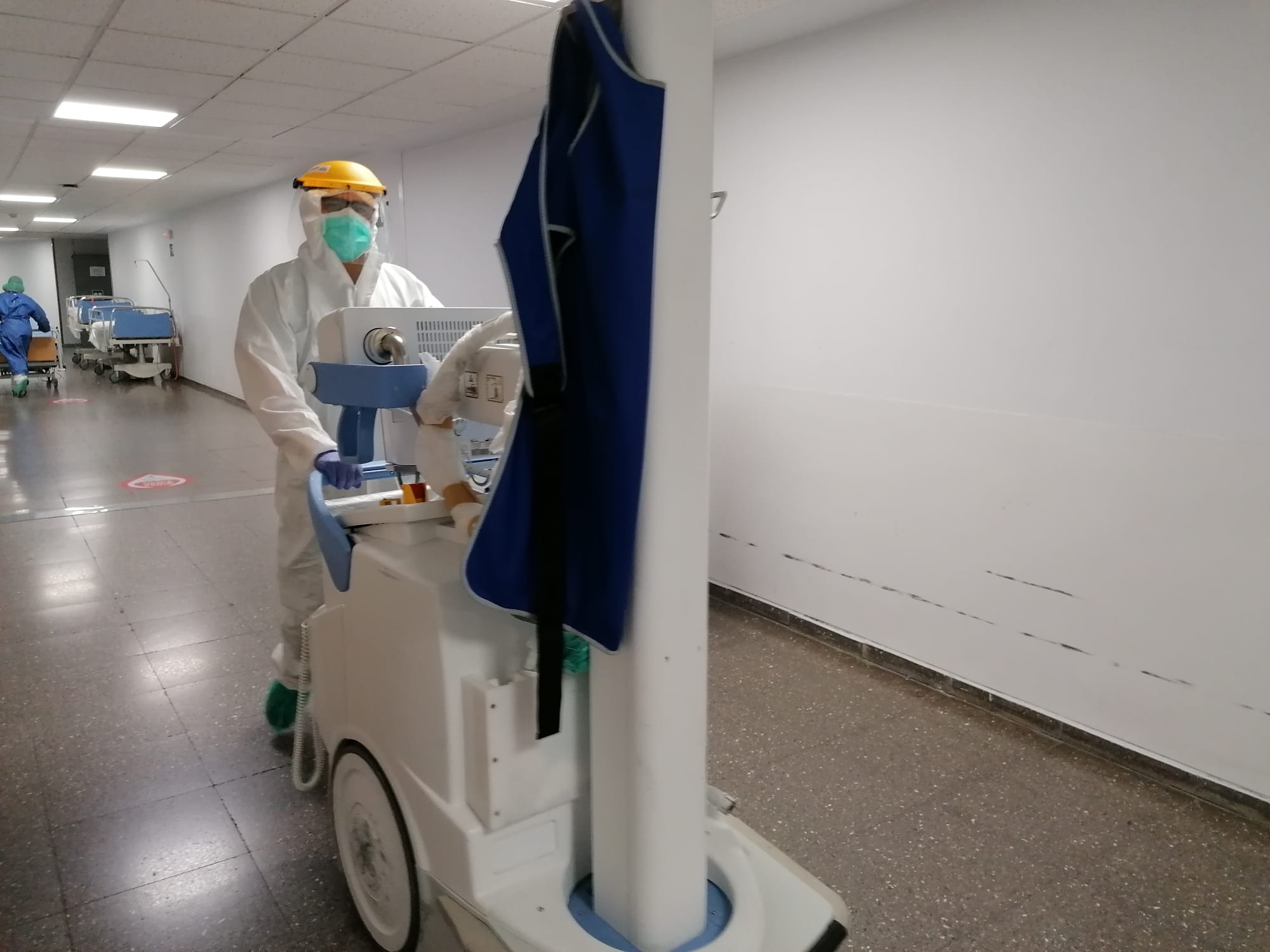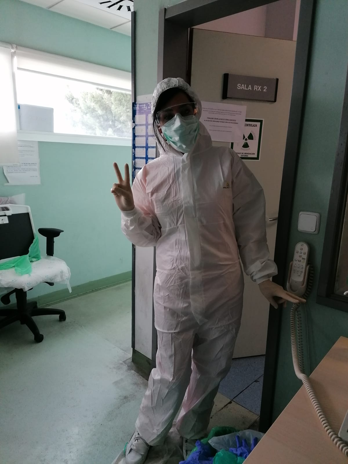 El “calvario” laboral por el que pasó sobre todo en los primeros pasos de la crisis es un fiel reflejo de cómo el virus cogió a todo el sistema sanitario con el pie cambiado. Desde febrero, el número de pruebas por TAC aumentó bastante, “aunque no sabíamos a que se debía”, con mucha patología de pulmón. En marzo, cuando se declaró el estado de alarma, “trabajábamos con mascarilla quirúrgica, una que nos dan a principios de turno, y no había EPIS (Equipos de Protección Individual) suficientes”. Gracias a las donaciones de la Comunidad de Madrid y de familiares, empezaron a trabajar con monos como EPIS y dos mascarillas quirúrgicas en vez de la Fpp2, “que es la que recomiendan”. Colino y sus compañeros realizaron esos días de 800 a 900 radiografías diarias en las plantas y en las UVI del hospital. En abril, les empezaron a equipar con material adecuado y ella volvió al TAC, tras el aumento de pacientes con posible tromboembolismo pulmonar. “Ahora trabajamos de dos en dos, para que uno se vista y el otro se mantenga limpio, e intentar contaminar lo menos posible”, afirma.