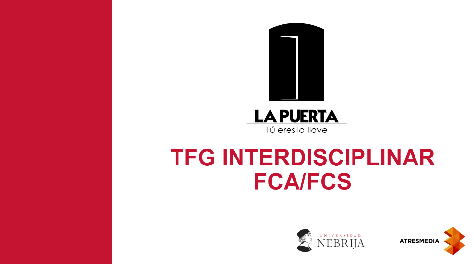 El proyecto La Puerta -Análisis del entorno audiovisual y propuesta de contenidos para Atresmedia- se alzó con el premio del Concurso Nebrija de Trabajos Fin de Grado Interdisciplinares en su primera edición. En una entrega online, los nueve alumnos del grupo expusieron su TFG del curso 2018-2019 que implicó a las Facultades de Comunicación y Artes y Ciencias Sociales y que intentó, desde múltiples puntos de vista, responder a la pregunta: “¿Cómo puede el grupo Atresmedia hacer frente a las nuevas plataformas digitales de contenido como Netflix o las páginas de contenidos audiovisuales como YouTube?