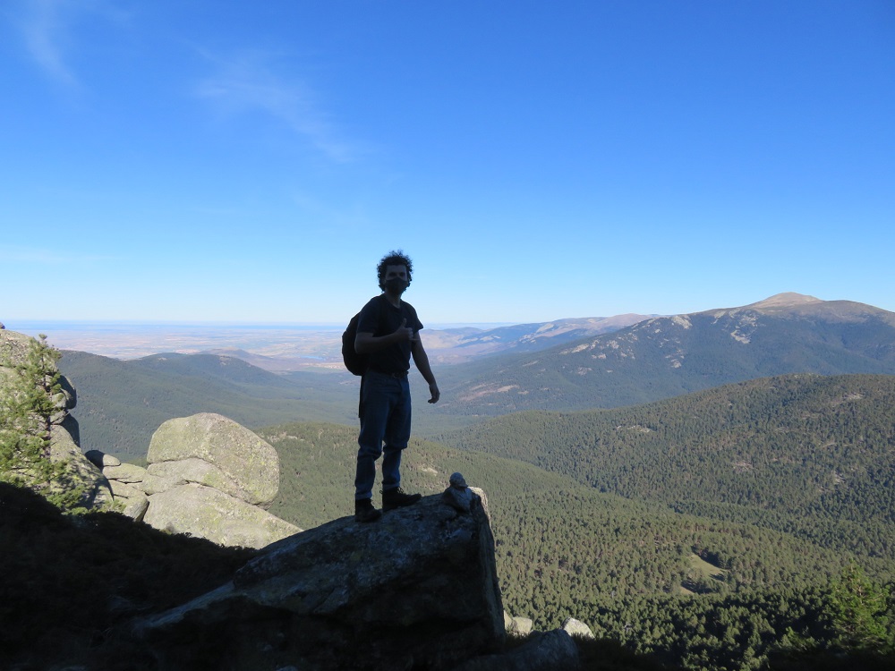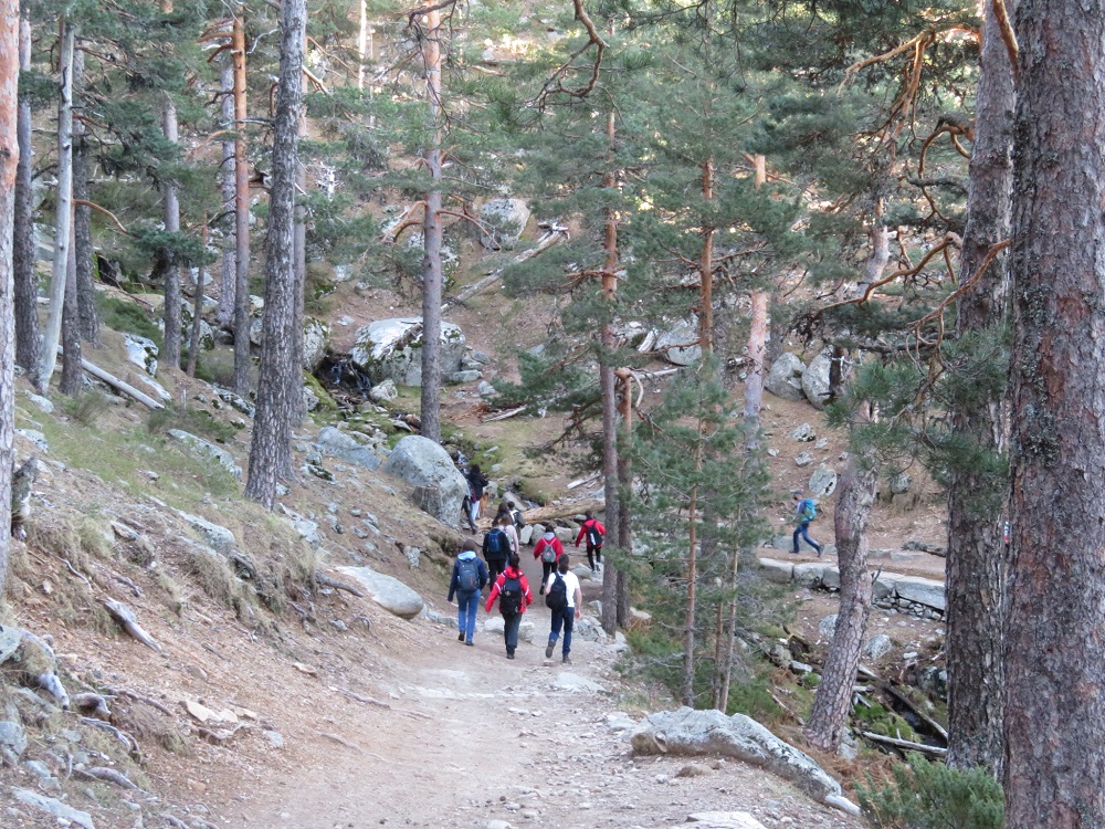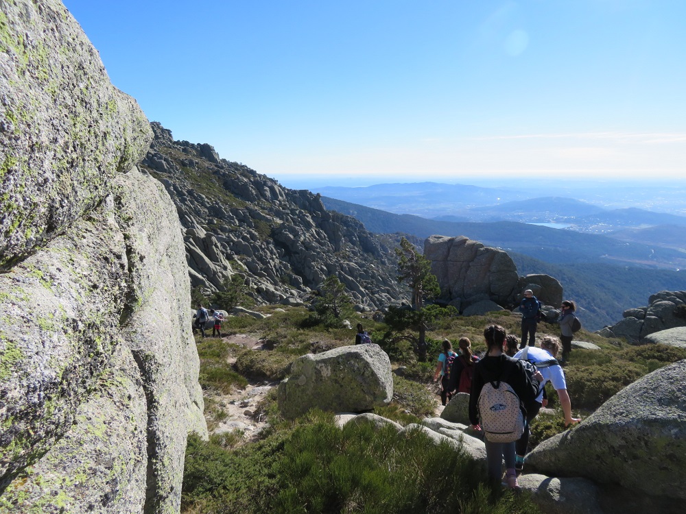 Tras llegar al puerto de Navacerrada, la ruta daba comienzo junto al punto que delimita la Comunidad de Madrid y la provincia de Segovia. Tras unos primeros pasos por la pista que une el puerto con la R.M. Los Cogorros, el grupo, un total de 30 alumnos, divididos en 5 subgrupos de 6 personas, -como establecen los actuales protocolos COVID para la práctica deportiva en la naturaleza-, se dirigió al Camino Schmidt para recorrerlo hasta el desvío que lleva al Collado Ventoso, punto en el que repusimos fuerzas durante unos minutos para la ascensión más exigente de la jornada hacia la cuerda de la los Siete Picos.