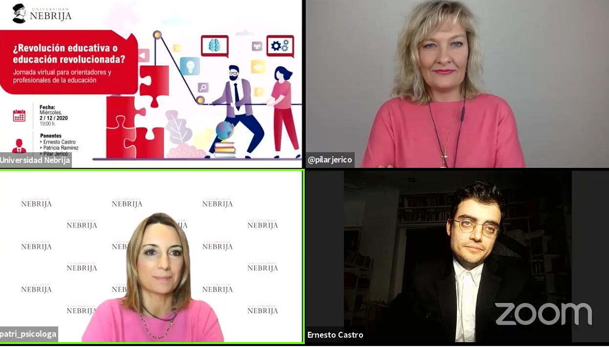 ¿Revolución educativa o educación revolucionada? Esta pregunta, que dio título a la Jornada Virtual para Orientadores y Profesionales de la Educación organizada por la Universidad Nebrija, no fue la única planteada en el coloquio virtual con orientadores, profesores, maestros, padres, psicólogos y trabajadores sociales. Sin embargo, después de cada interrogante, el filósofo Ernesto Castro, la psicóloga Patricia Ramírez y la comunicadora Pilar Jericó brindaron su experiencia y conocimientos sobre la tolerancia a la frustración, el miedo al fracaso, la disciplina o la motivación en el entorno educativo y familiar. La sesión, moderada por María Gil, directora de Comunicación de la Universidad Nebrija, recogió un enfoque multidisciplinar y alejado de dogmas y prejuicios. Las palabras volcadas en el debate sirvieron para la reflexión en mentes de todas las edades.
