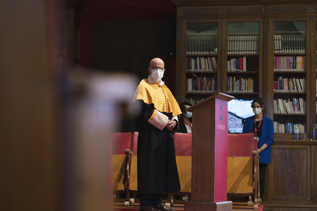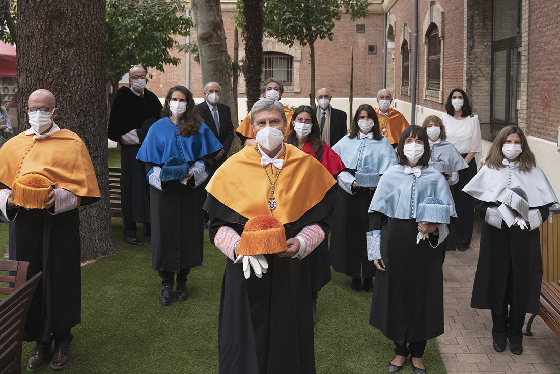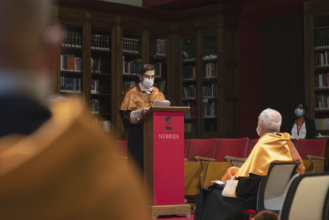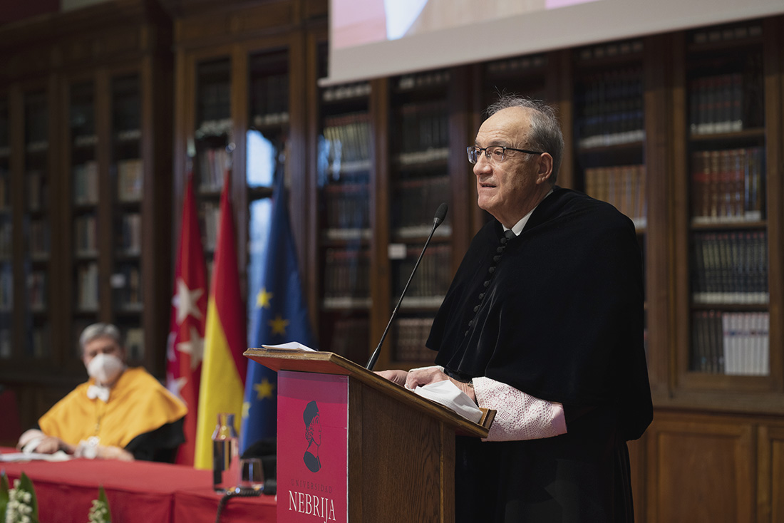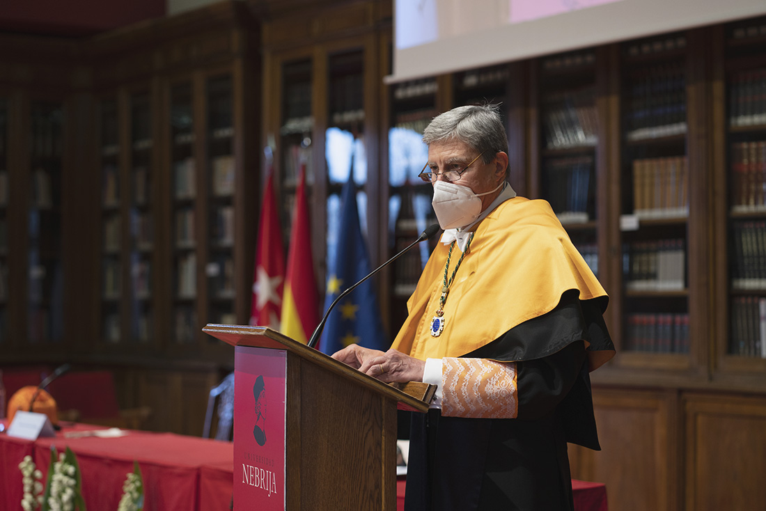 Con un cortejo muy reducido y con el público siguiendo el acto en streaming, se reunieron en el Salón de Grados del Campus de Madrid-Princesa los decanos, el rector, José Muñiz, el presidente de la Fundación Antonio de Nebrija, Manuel Villa-Cellino, y el catedrático de Economía Aplicada de la Facultad de Ciencias Sociales, José Luis García Delgado, encargado de impartir la lección magistral de este año.