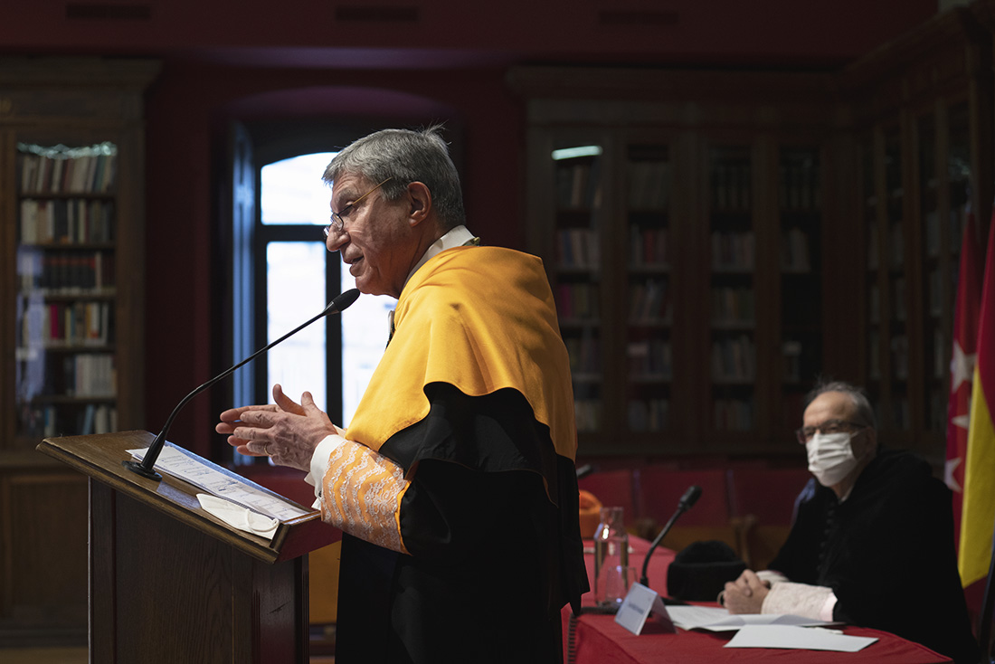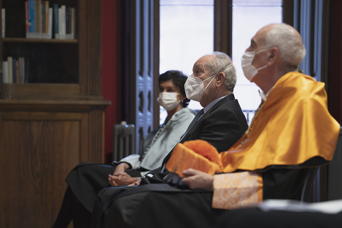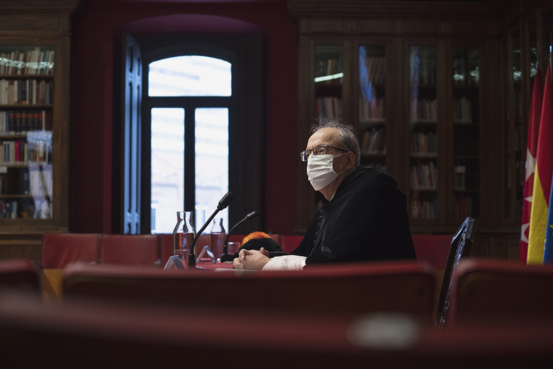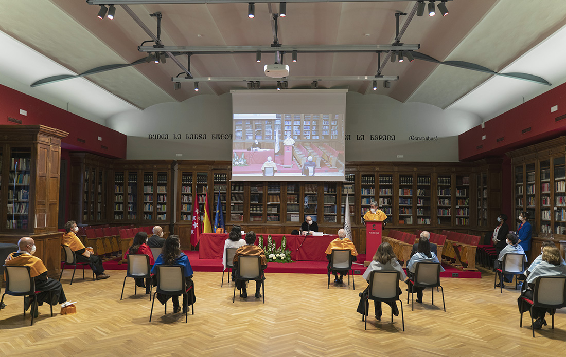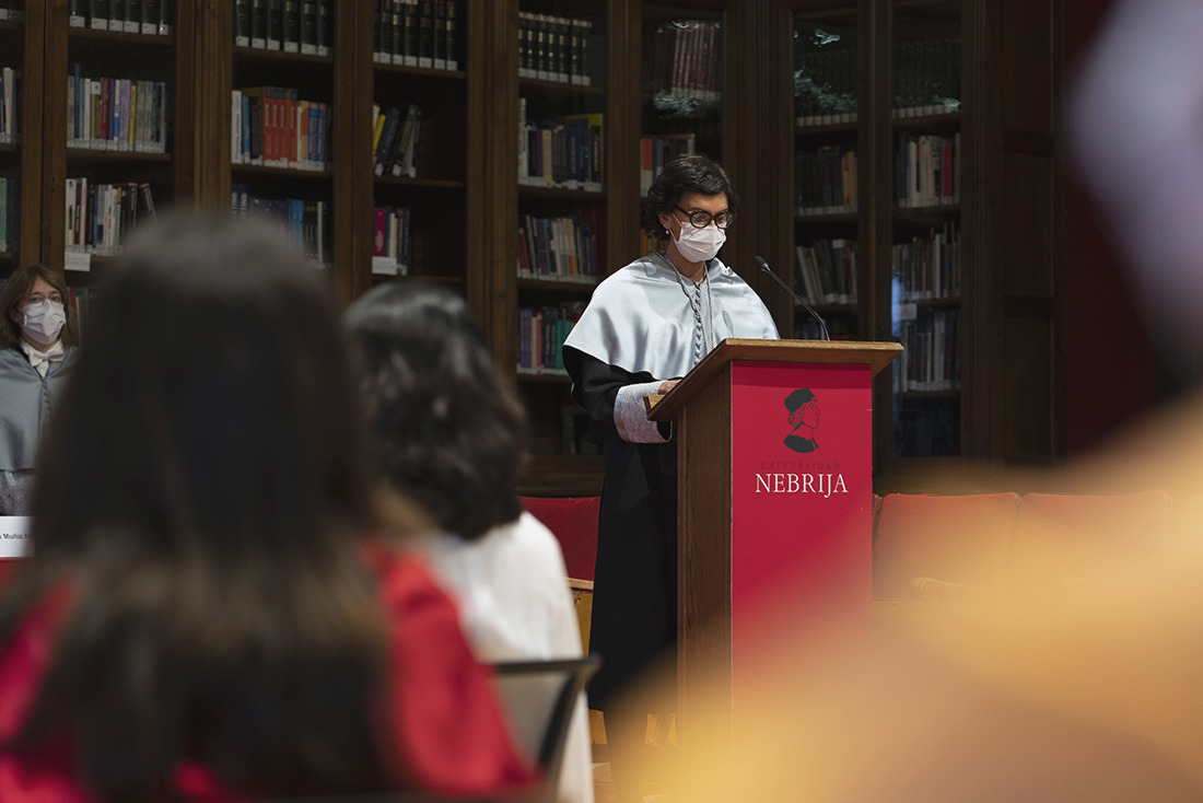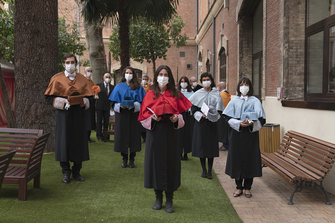 Con un cortejo muy reducido y con el público siguiendo el acto en streaming, se reunieron en el Salón de Grados del Campus de Madrid-Princesa los decanos, el rector, José Muñiz, el presidente de la Fundación Antonio de Nebrija, Manuel Villa-Cellino, y el catedrático de Economía Aplicada de la Facultad de Ciencias Sociales, José Luis García Delgado, encargado de impartir la lección magistral de este año.