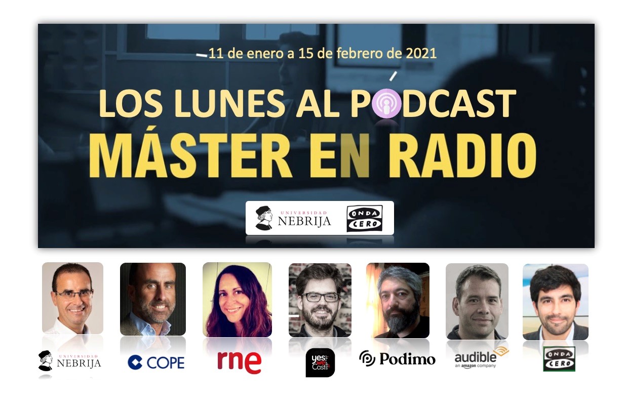 Pódcast, podcast o podcast… si bien no nos ponemos de acuerdo en la grafía, su eco resuena en los diferentes soportes digitales y poco a poco se hacen un hueco en nuestra ajetreada vida diaria. Para ordenar y estructurar este fenómeno, sin poner puertas al audio, el Máster en Radio–Onda Cero de la Universidad Nebrija organizó del 11 de enero al 15 de febrero las jornadas Los lunes al pódcast. Nunca los primeros días de la semana, tras Filomena y en plena segunda ola de pandemia, proyectaron un sonido tan especial en invierno.